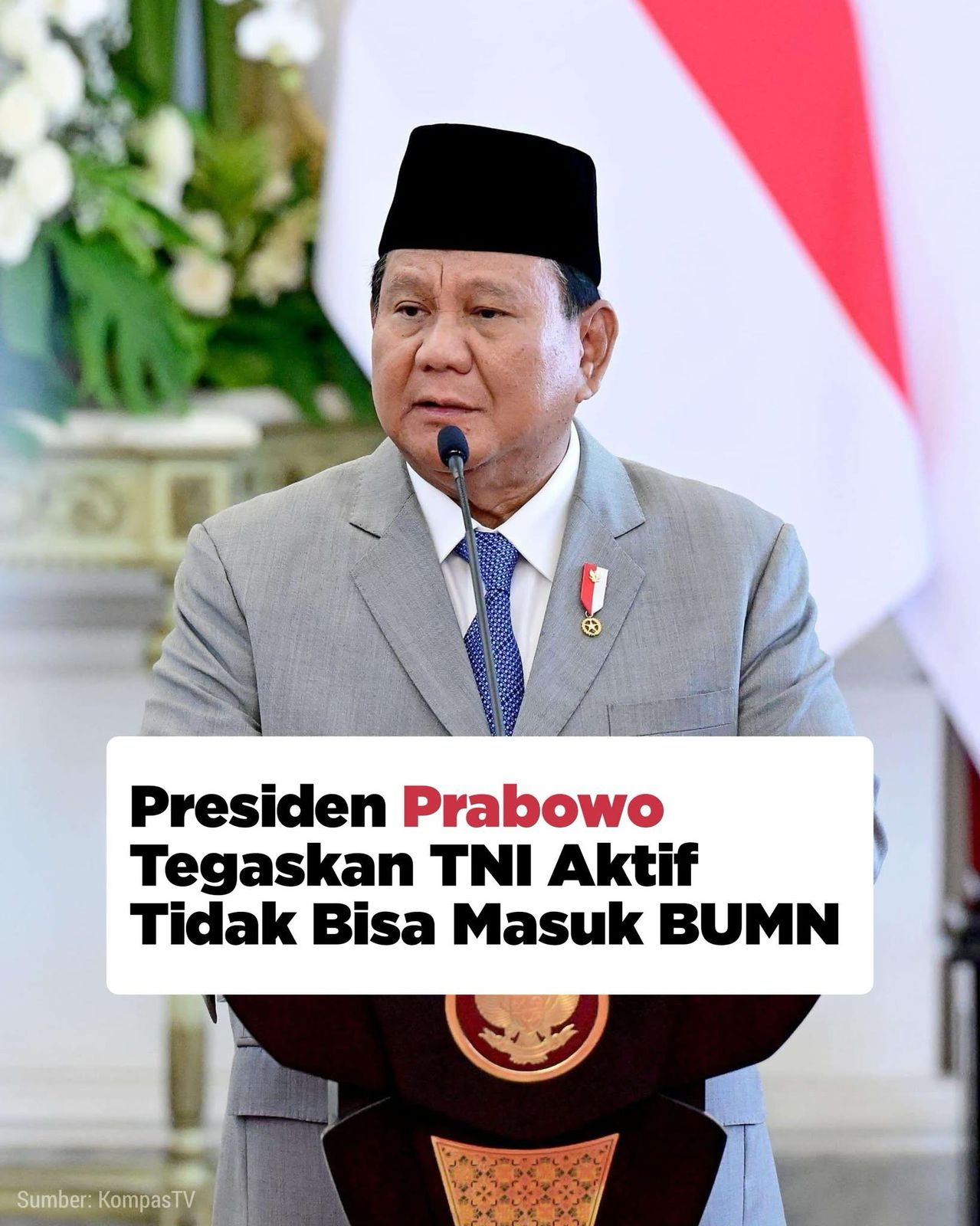 “TNI aktif tidak bisa masuk BUMN. Yang boleh hanya pensiunan TNI. Pensiunan TNI adalah warga sipil juga. Jika sudah sipil, tidak boleh ada dikotomi TNI atau bukan TNI. Semua patriot dengan hak yang sama,” ujar Presiden Prabowo.