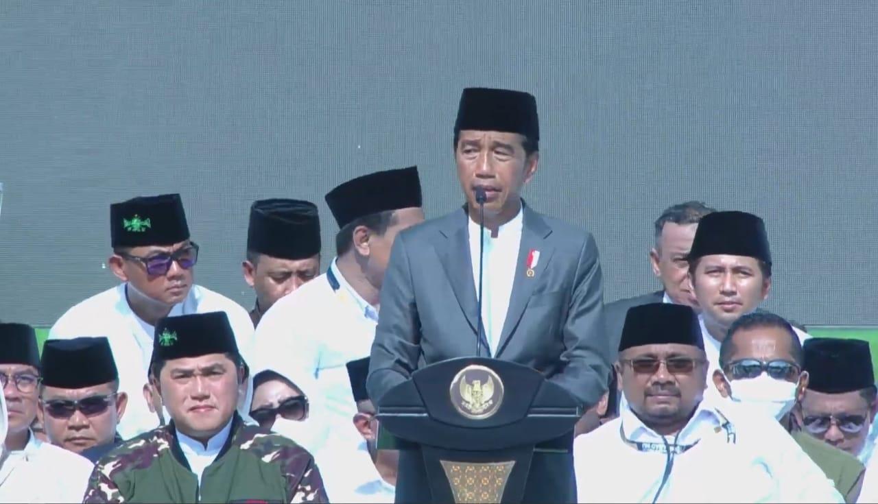 “Pertama-tama atas nama rakyat Indonesia, saya mengucapkan taniah dan syukur, mengucapkan tasyakur, terima kasih dan bersyukur atas peran NU untuk bangsa dan negara,”tutur Jokowi dalam pidatonya.