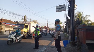 Provost Polres Badung rutin cek pelaksanaan PH pagi yang tergelar di jalan di wilayah Polres Badung. Kini satu anggota Provost mengecek personil di Simpang Beringkit, Kecamatan Mengwi, Kabupaten Badung, Bali. Rabu, (27/9/2023) pagi 06. 55 WITA.