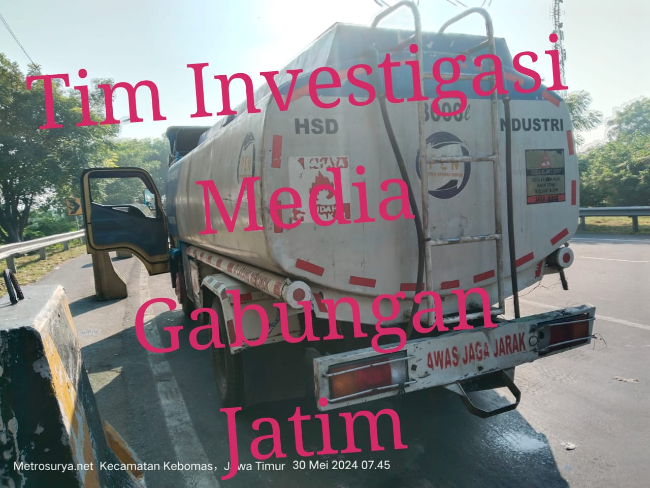 Diduga Bahan Bakar Minyak (BBM) solar ilegal yang sedang diangkut oleh truk pengangkut BBM solar dari wilayah Blora Jawa Tengah kepergok anggota tim Investigasi LP KPK, BPKP, dan Tim Media gabungan online Jatim. Pada saat investigasi tim melihat satu unit mobil tangki berkapasitas 8000 liter, berwarna biru putih dengan logo PT. PEN, akan tetapi tangki berlogo PT. PEN diduga tidak ada tulisan Transportir dan Suplier Solar Industri, sesuai peraturan perijinan. Setelah tim investigasi membuntuti mobil tangki tersebut berhenti di Jalan Kebomas dan masuk ke Pintu Tol Kebomas Gresik Pada Hari Kamis (30/05/2024) pagi, jam 07: 54 WIB.