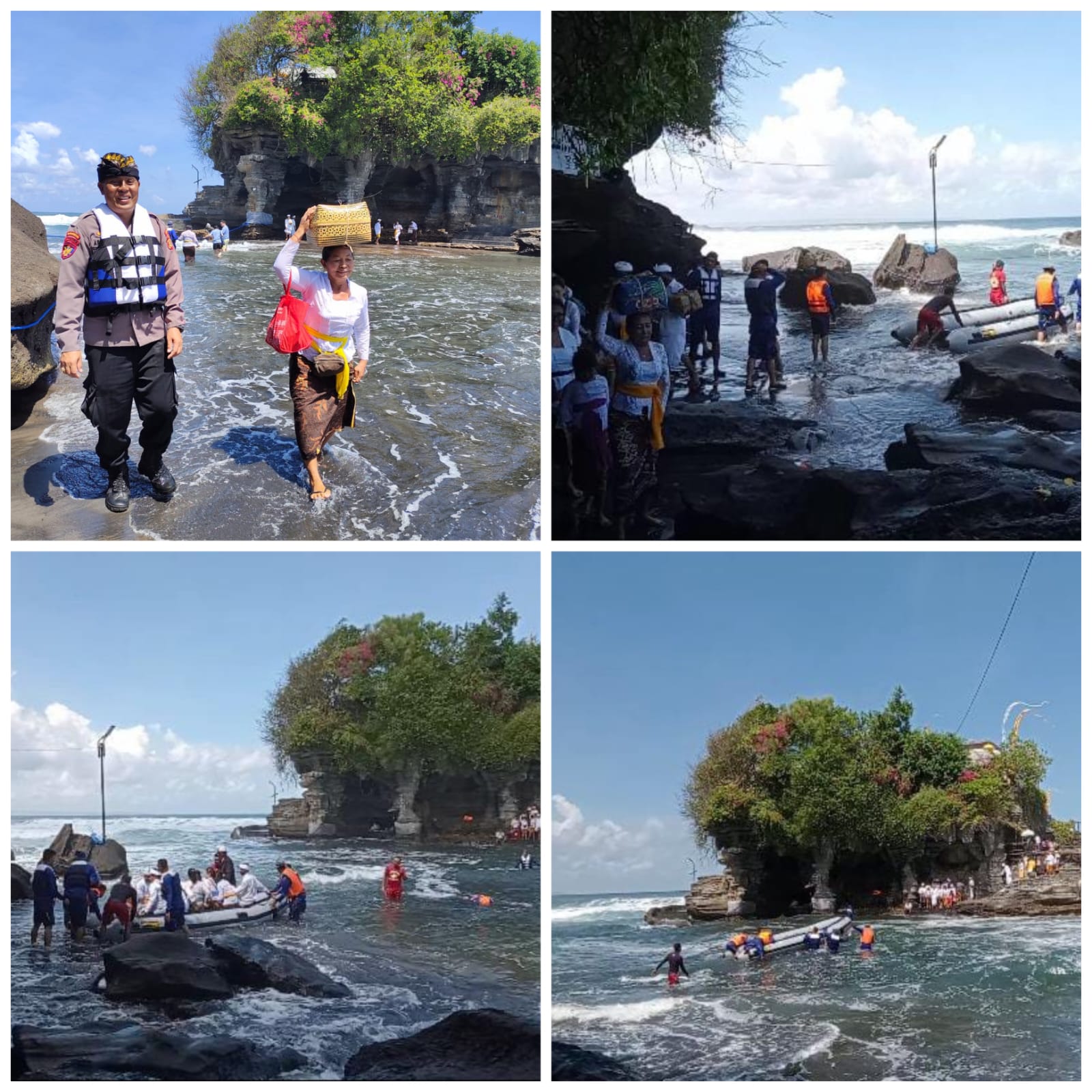 Pada saat air laut pasang seperti pada pukul 09.00 Wita, dimana pelaksanaan upacara Pujawali harus sudah dimulai, personil satuan Pol Airud Polres Tabanan bersama dengan lifeguards, dan Pecalang Pura luhur Tanah Lot, membantu para pengempon Pura, pemangku dan penganceng dari Puri Kediri serta pengenter karya, menyeberangkan dengan menggunakan rubber boat.