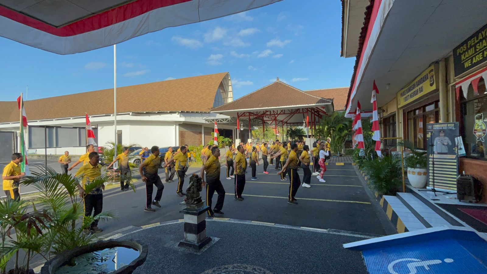 Polres Kawasan Bandara I Gusti Ngurah Rai melaksanakan kegiatan olah raga senam aerobix yang dilaksanakan di halaman mapolres setempat dengan menghadirkan pesenam atau instruktur senam yang berpengalaman, sabtu (19/8/2023).