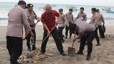 Puluhan personil Polres Kawasan Bandara I Gusti Ngurah Rai bersama Lanud I Gusti Ngurah Rai dan masyarakat di kerahkan untuk melakukan kegiatan aksi bersih-bersih di sepanjang Pantai Sekeh Kuta Badung, kamis (13/7/2023).