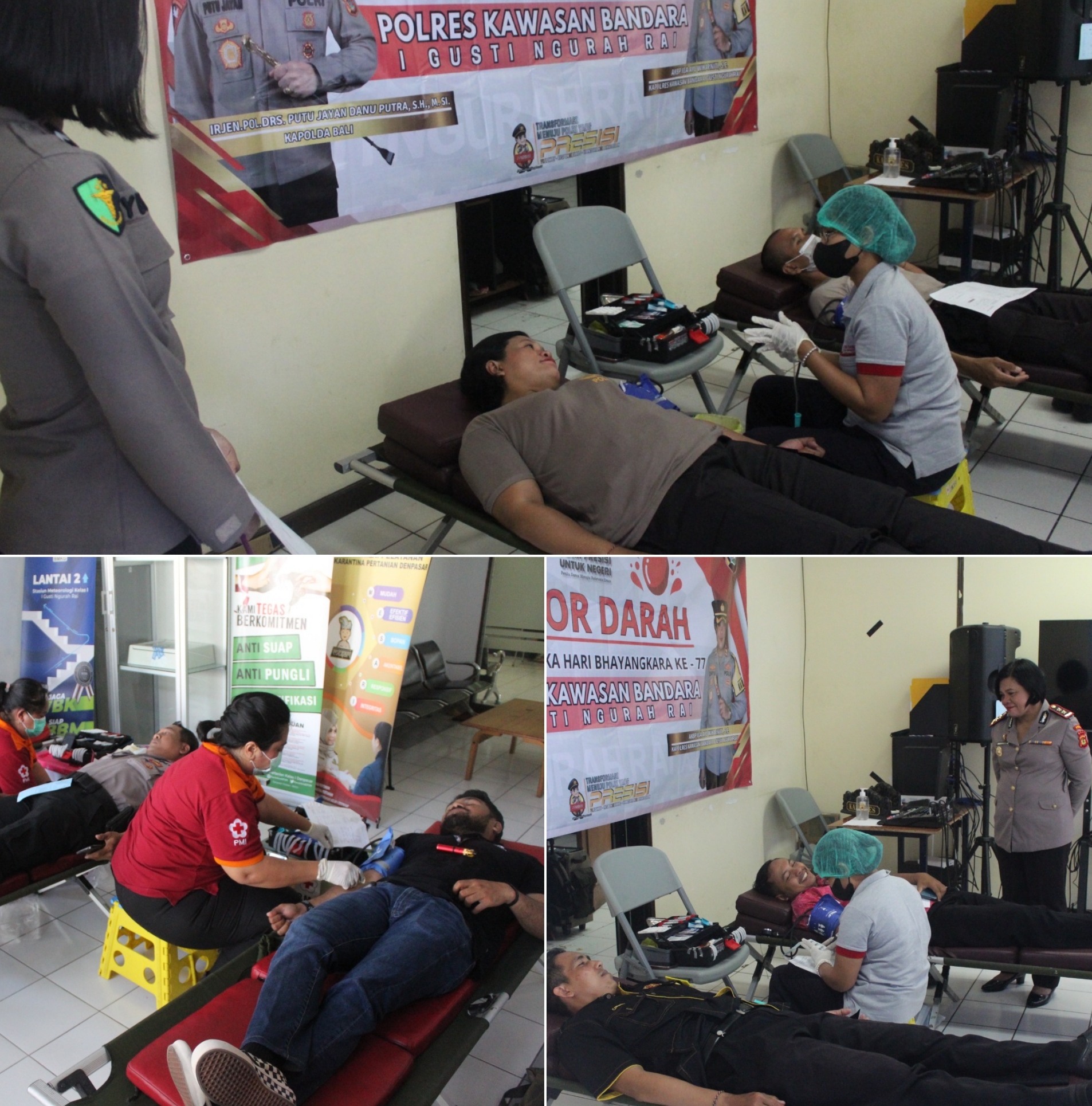 Polres Bandara– Mendekati peringatan Hari Bhayangkara ke-77 tanggal 1 Juli 2023, Polres Kawasan Bandara I Gusti Ngurah Rai menggelar kegiatan donor darah yang dilaksanakan hari Selasa (27/6/2023) di Ruang Rapat Utama (Rupatama) Polres setempat.