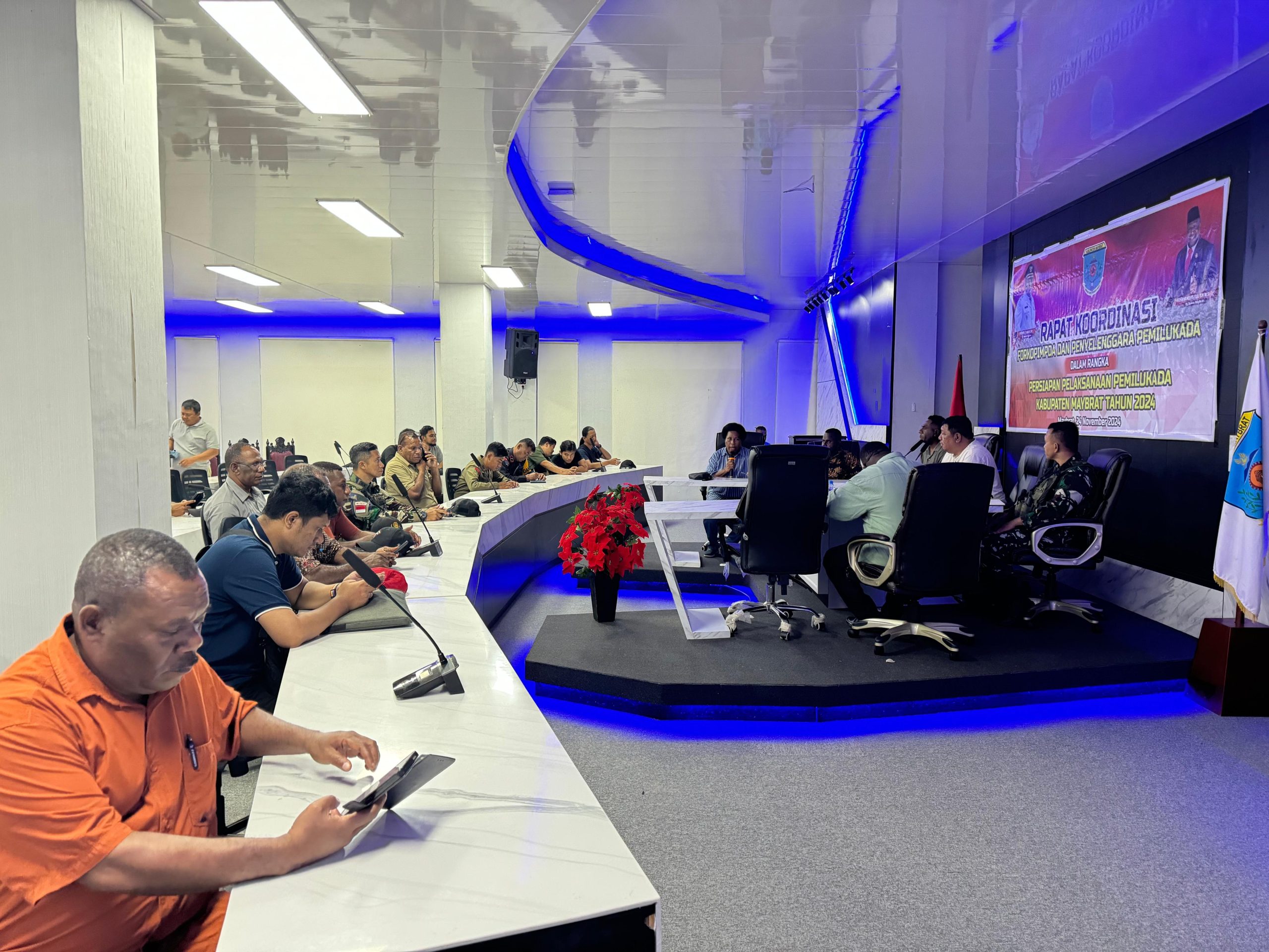 Rapat dipimpin oleh PJ Bupati Maybrat, Vicente Campana Baay, S.IP, bersama dengan Asisten I Setda kabupaten Maybrat, Dra Yohana Ick, Ketua DPRK Maybrat, Kapolres Maybrat, Dandim 1809, serta Ketua KPU Kabupaten Maybrat dan Bawaslu setempat di kabupaten Maybrat.