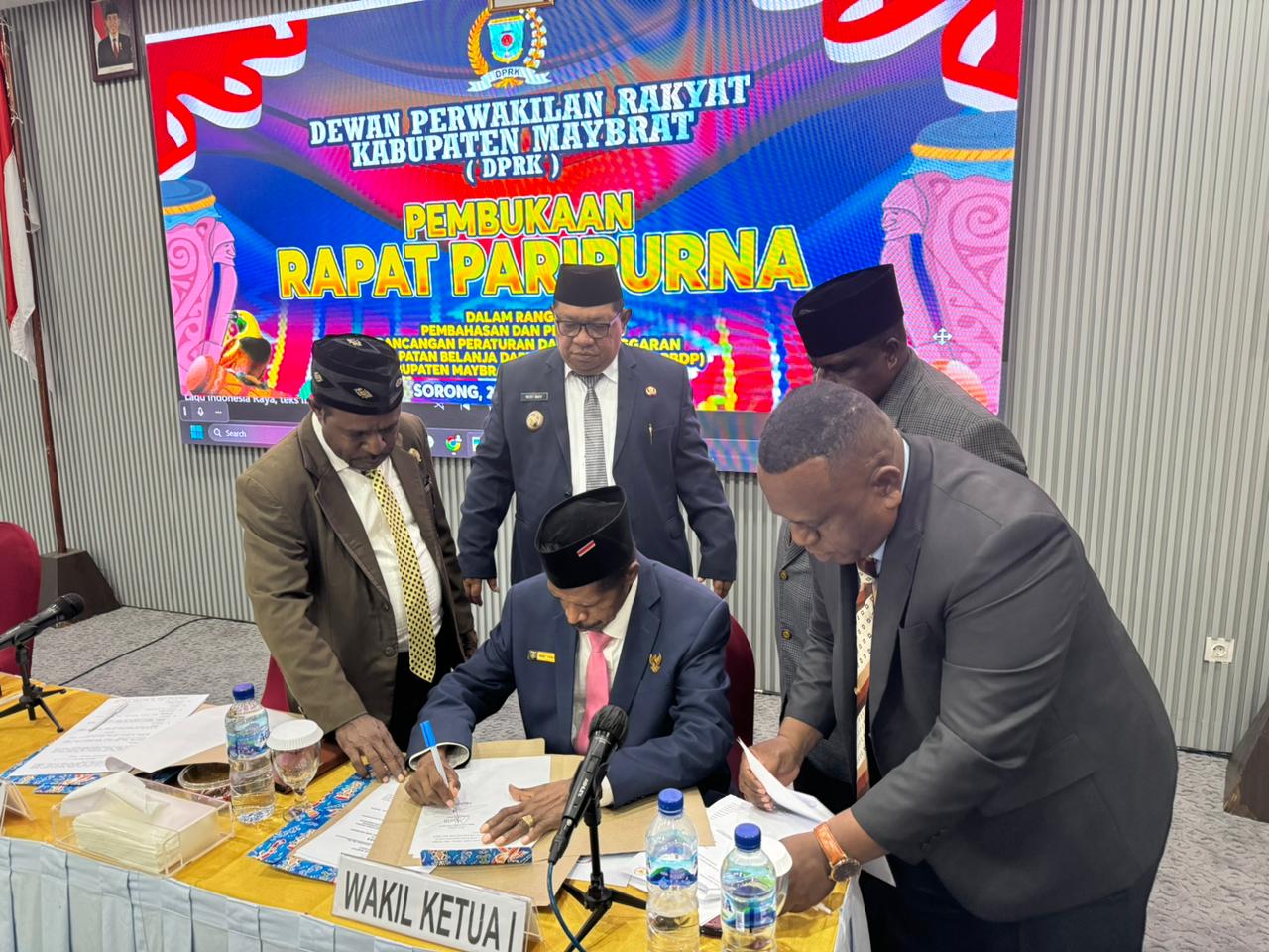 Kota Sorong PBD – Rapat paripurna Dewan Perwakilan Rakyat (DPRK) Kabupaten Maybrat, tentang APBD perubahan tahun anggaran 2024 menjadi Raperda pada hari ke dua (27/9/24) dengan mengagendakan beberapa pembahasan diantaranya Penjelasan penjabat (PJ) Bupati Maybrat Vicente Campana Baay, S.IP, atas Raperda Perubahan APBD Tahun Anggaran 2024 dan Nota Keuangan, Pemandangan Umum (PU) Fraksi atas Raperda tentang Perubahan APBD Tahun Anggaran 2024 dan Penetapan Persetujuan Rancangan Keputusan DPRK tentang Raperda Tahun 2025 yang bertempat di ruang rapat Gandaria, JLn. Gunung Merapi, kelurahan Klabala, distrik Sorong kota, Provinsi Papua Barat Daya.