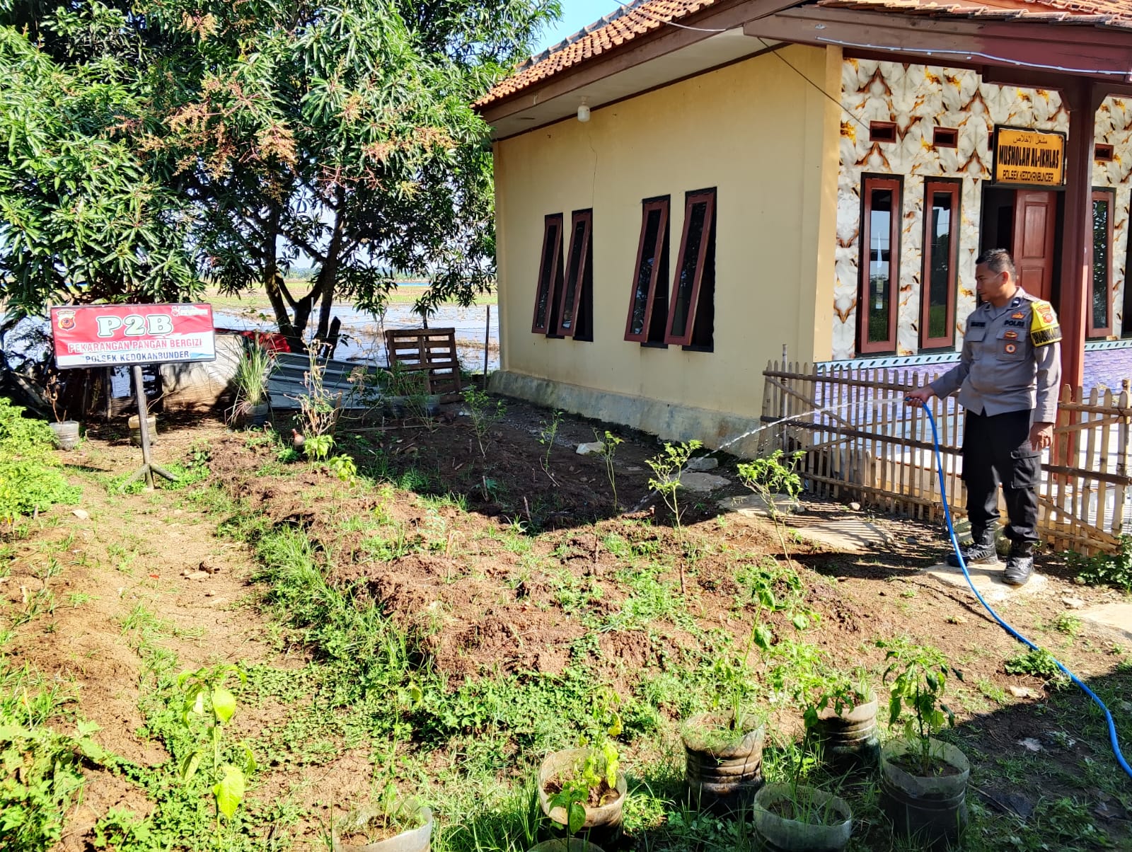 Indramayu – Dengan mengenakan seragam dinas lengkap, AIPDA Ismantoro tampak tekun menyiram tanaman cabai, terong, dan kacang yang tumbuh di lahan sempit di samping Musala Al-Ikhlas, lingkungan Mapolsek Kedokanbunder, Kabupaten Indramayu. Kamis (10/7/2025)