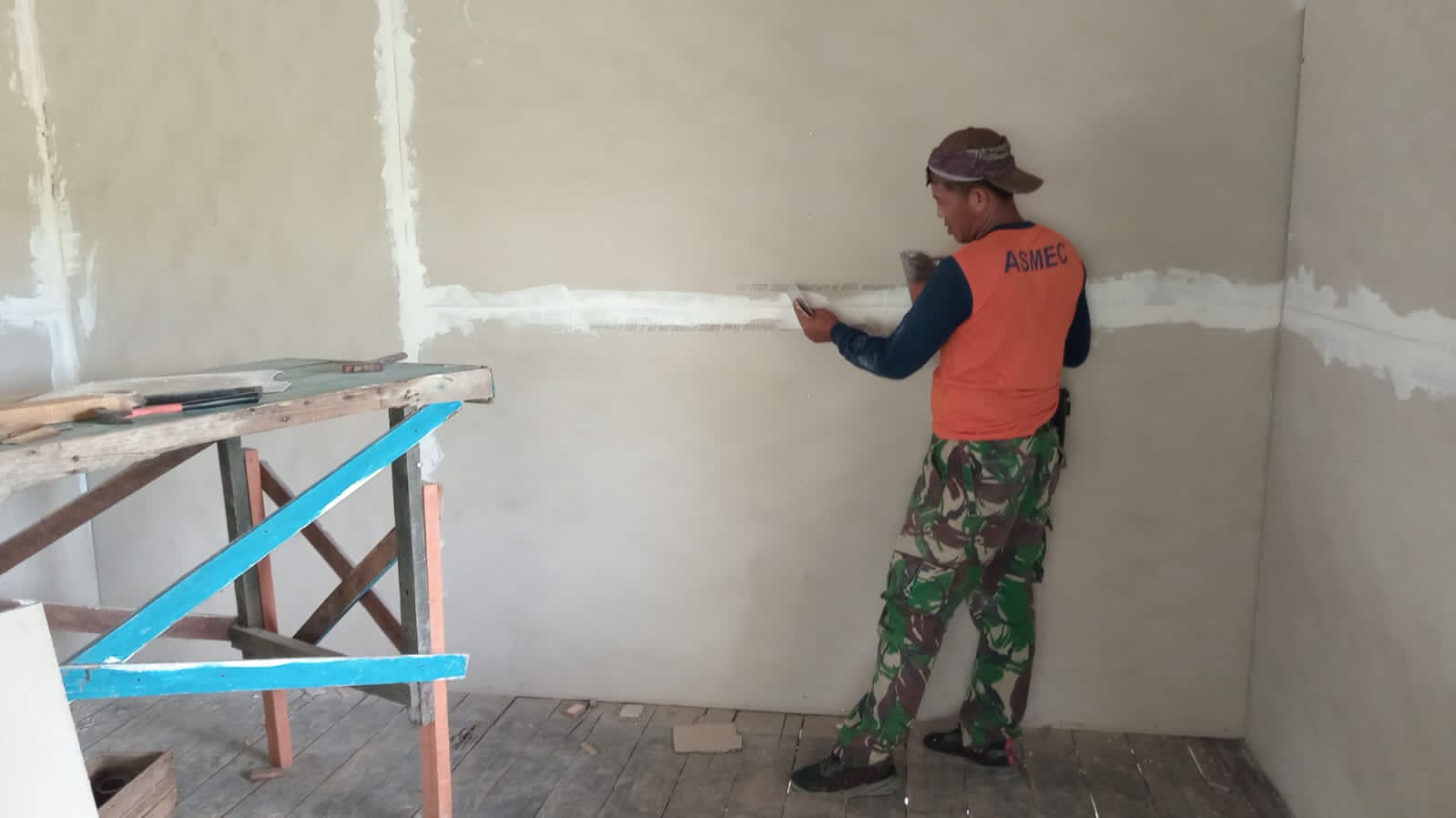 Anggota Satgas TMMD bekerja dengan sigap dan teliti, memastikan setiap lembar kalsiboard terpasang dengan rapi dan presisi. Semangat kebersamaan dan kekompakan terpancar dari para prajurit yang bahu-membahu dalam menyelesaikan tugas ini, menunjukkan dedikasi mereka dalam mendukung fasilitas umum di desa.