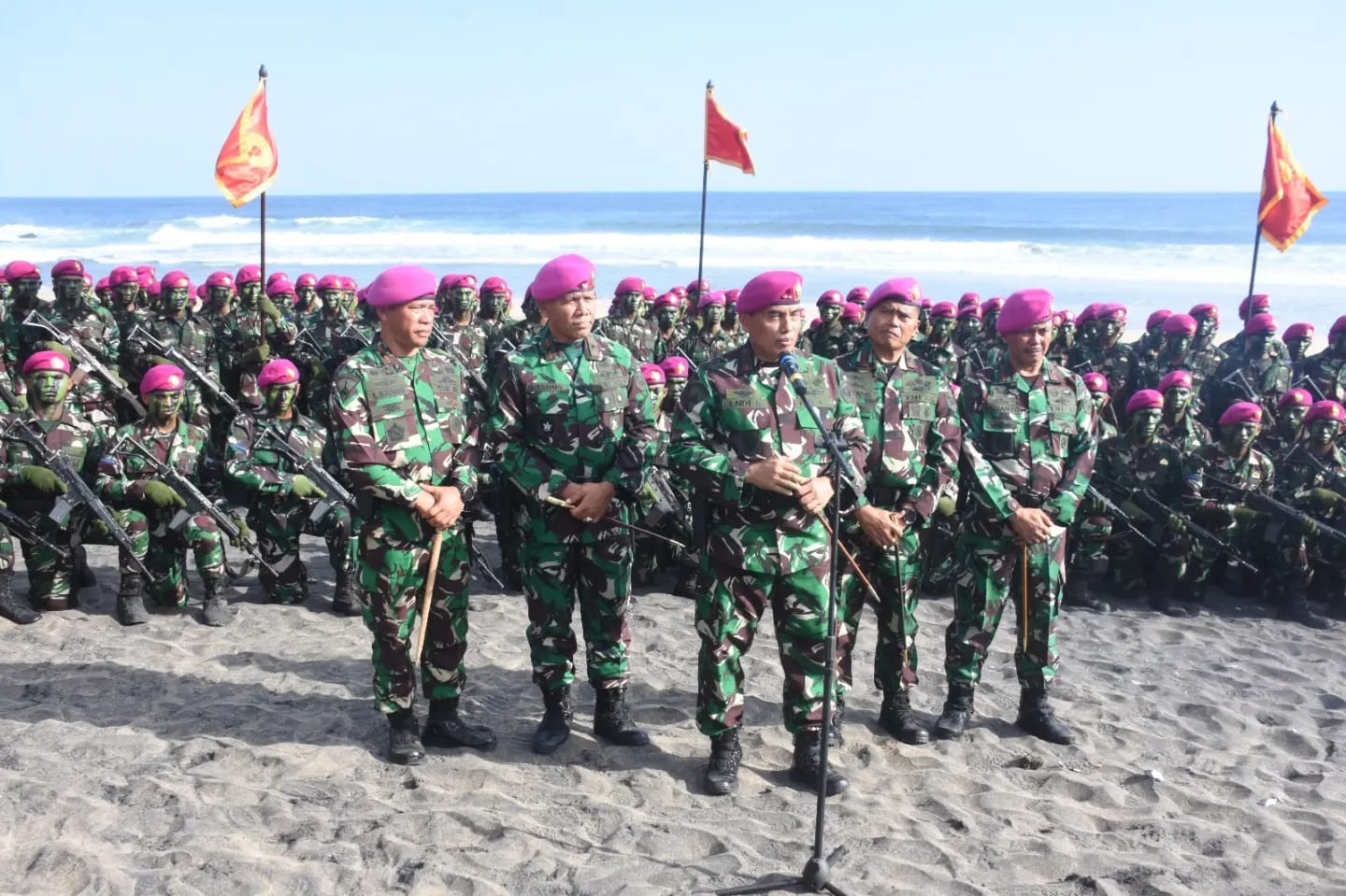 KOTA SORONG PBD, BUSERJATIM.COM GROUP – Komandan Pasmar 3 Brigjen TNI (Mar) Sugianto, S.Sos., M.M., M.Tr.Opsla., didampingi Ketua Korcab Jalasenastri Pasmar 3 Ny. Rita Sugianto, menghadiri upacara pembaretan Siswa Pendidikan Bintara dan Tamtama angkatan 43 gelombang 2 Korps Marinir di Pantai Baruna Kondang Iwak, Dusun Sumberpucung, Desa Tulungrejo, Kecamatan Donomulyo, Kabupaten Malang, Jawa Timur. Sabtu (14/09/2024).
