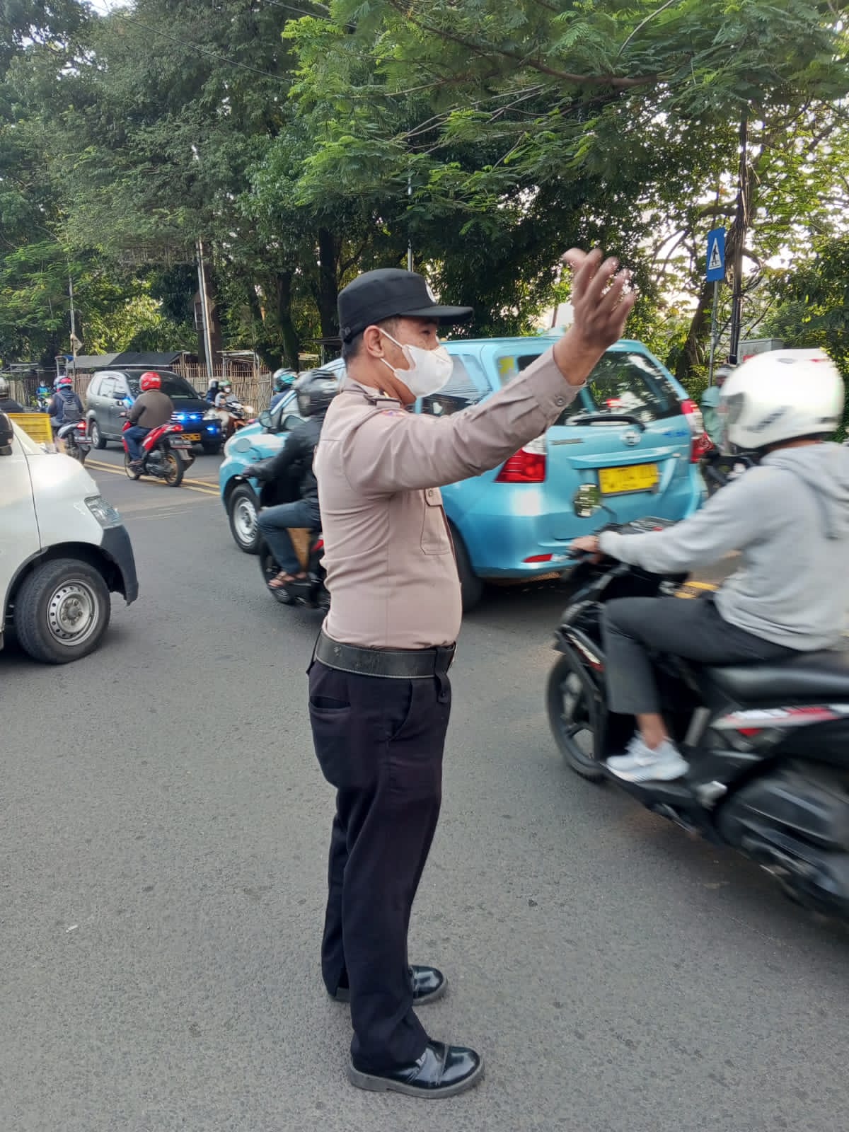 Personel SPKT Polsek Sukaraja Polres Bogor melaksanakan kegiatan pengamanan pagi disimpang persimpangan dan sekolah yang ada di Wilkum Polsek Sukaraja Polres Bogor, Senin (14/08/2023).
