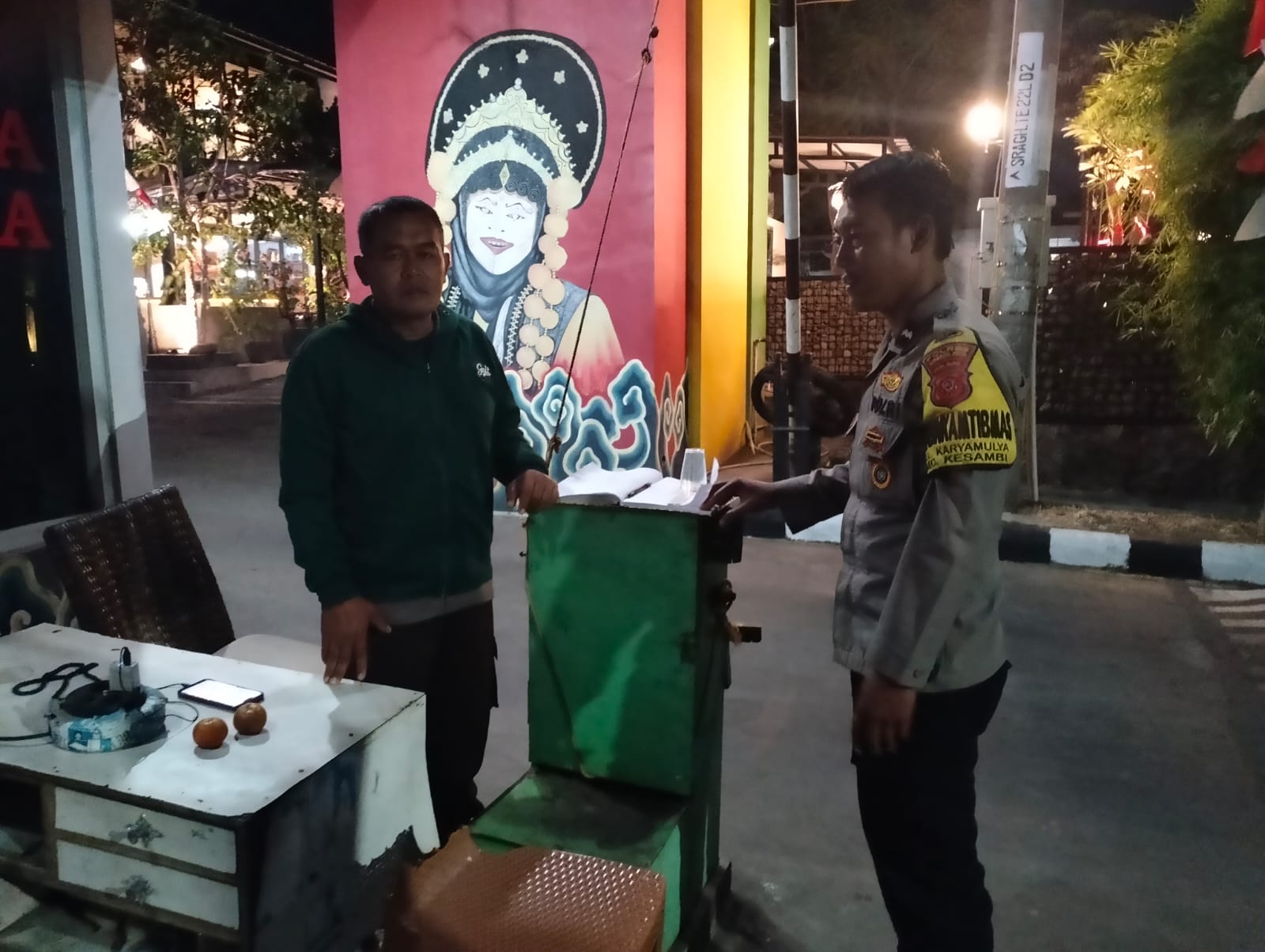 Bhabinkamtibmas Kelurahan karya Mulya Aipda Eko , sambangi sambangi petugas jaga malam di RW 06 kelurahan karya Mulya melalui berikan binluh Kamtibmas, Minggu malam (25/08/2024).