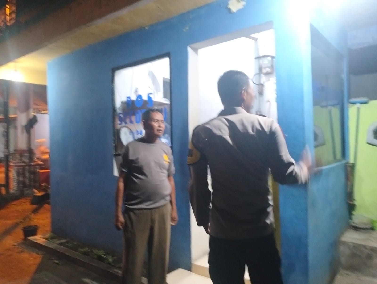 Bhabinkamtibmas Kelurahan karya Mulya Aipda Eko , sammbangi sambangi petugas satpam perumahan harapan mulya melalui berikan binluh Kamtibmas,Sabtu malam (20/07/2024).