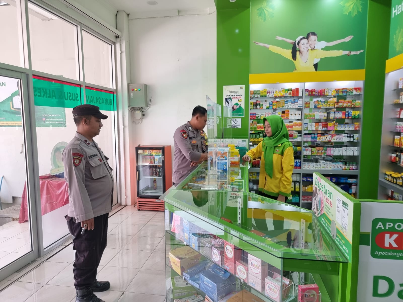 Majalengka – Sesuai arahan dari Kapolres Majalengka Polda Jabar AKBP Indra Novianto,S.I.K.,M.Si., CPHR., Kapolsek Cikijing AKP Rudy Djunardi M, S.H., M.H.melalui Personil Polsek Cikijing Polres Majalengka Polda Jabar, Ps. Panit Samapta l Aipda Eman Subagja bersama Bhabinkamtibmas Bripka Dede Arif menyambangi Apotek K-24 di Blok Salasa Desa Cikijing, Kecamatan Cikijing, Kabupaten Majalengka, Rabu (04/10/2023).