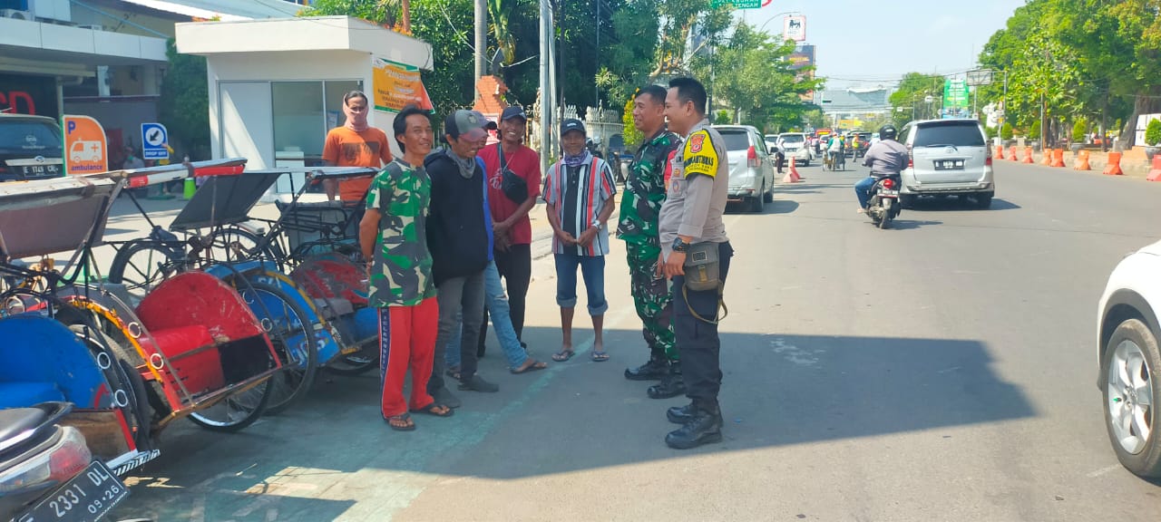 POLRES CIREBON KOTA – Polsek Cirebon Utbar, Melalui Patroli Dialogis, Bhabinkamtibmas dan Babinsa Kelurahan Kebon Baru Bripka Solih dan Sertu Yosef bersinergi sambangi tukang becak yang mangkal di Jalan Siliwangi Kota Rabu (19/07/2023)