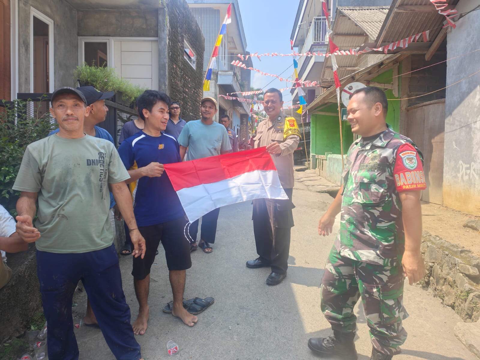 Bogor – Dalam rangka menyambut Hari Ulang Tahun ke-80 Republik Indonesia, Bhabinkamtibmas Desa Pasir Mukti, Polsek Citeureup, Polres Bogor, Polda Jabar, Aiptu Ence Herdy, bersama Babinsa serta Forkopimdes Desa Pasir Mukti, melaksanakan kegiatan kerja bakti dan pembagian bendera merah putih pada Minggu pagi (03/08/2025).
