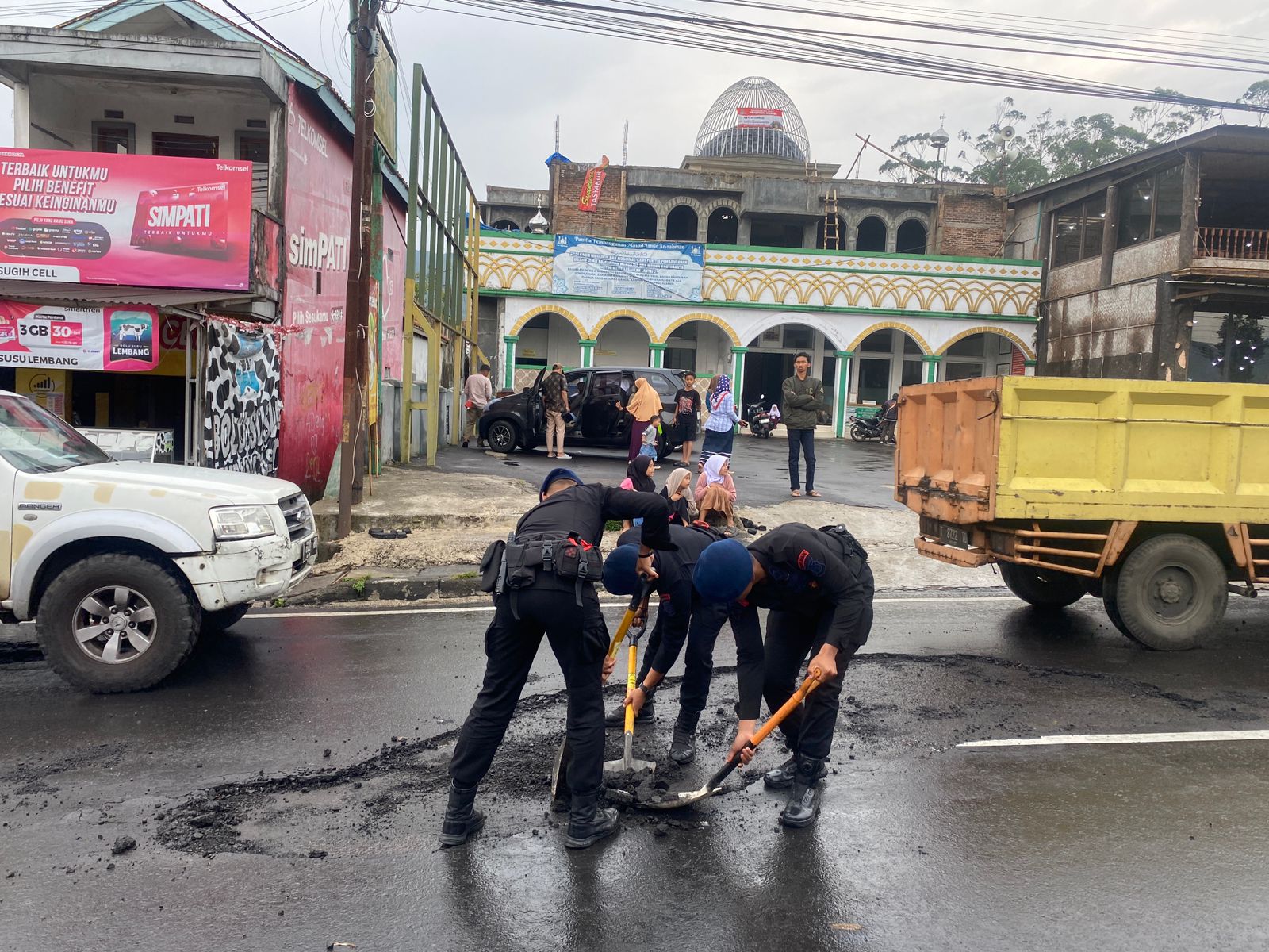 Material yang terbawa arus air tersebut menumpuk di badan jalan dan berpotensi membahayakan pengguna jalan, terutama pengendara roda dua. Menyadari hal ini, personel Brimob segera turun tangan melakukan pembersihan agar jalan kembali aman dan nyaman dilalui.
