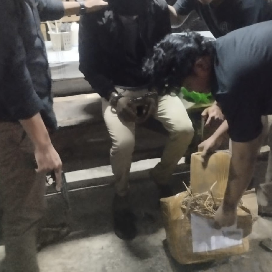 Dalam penggeledahan, petugas berhasil menyita barang bukti berupa 2 bungkus narkotika jenis ganja kering dengan total berat 2 kg bruto yang terbungkus dalam 1 kotak paket.
