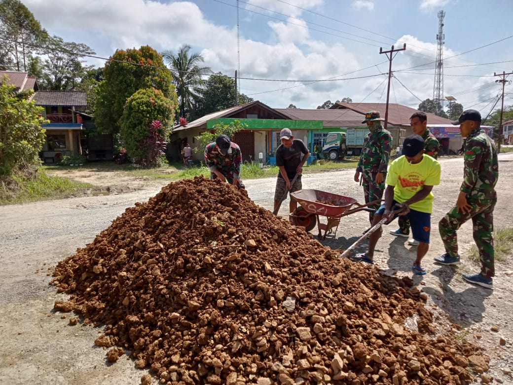 SANGGAU, KALBAR – Wujud Peduli terhadap wilayah binaan dan keselamatan pengendara diwilayah perbatasan serta dalam rangka menunjang tugas pokok di bidang territorial, Personel Satuan Tugas Pengamanan Perbatasan (Satgas Pamtas) RI-Malaysia Yonif 645/Gardatama Yudha dalam hal ini Pos Lubuk Tengah Bersama warga masyarakat perbatasan melaksanakan Karya Bakti perbaikan penambalan jalan yang berlubang, bertempat di Dusun Lubuk Tengah, Desa Lubuk Sabuk, Kecamatan Sekayam, Kabupaten Sanggau.