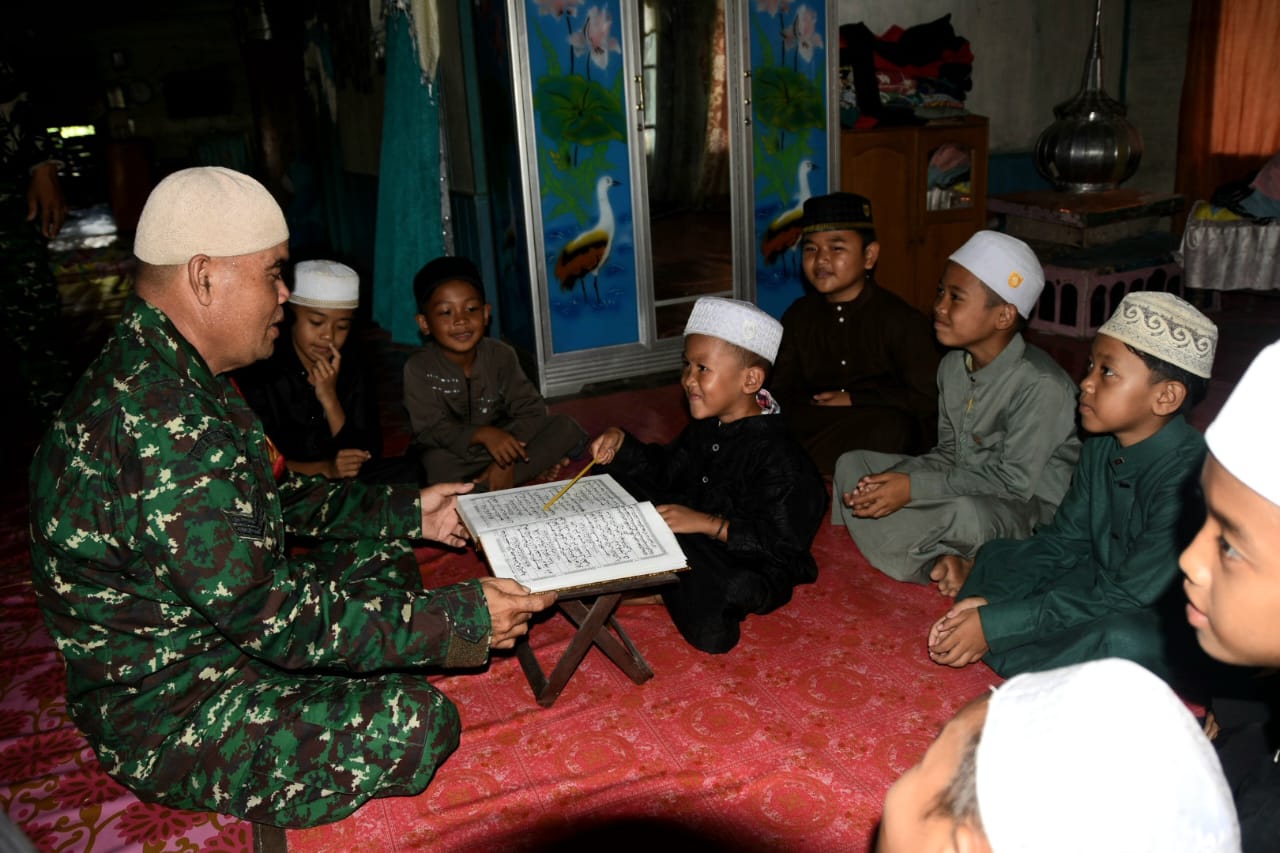 Salah satu wujud kegiatan tersebut adalah ketika seorang anggota Satgas TMMD ke-124 Kodim 1002/HST meluangkan waktu untuk mengajar anak-anak mengaji Al-Qur’an di Langgar Darussalam pada Sabtu (17/5) malam.