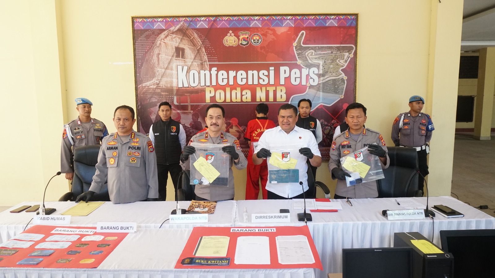 Dari Pengungkapan tersebut diamankan terduga pelaku S, Pria 41 tahun, alamat Lombok Tengah dan HW, Pria 38 tahun Alamat Lombok Tengah. Bersama itu tim berhasil mengumpulkan beberapa barang bukti seperti satu unit Sepeda Motor, 4 lembar Kwitansi Pembayaran Pelatihan dan pemberangkatan ke luar negeri, 1 lembar boarding pass lion air, 2 unit Hp tersangka, 3 SIM card tersangka, 1 CPU, 2 Spanduk organisasi, 1 bendel blangko kosong perekrutan PMI, 4 buah buku tabungan, 1 bendel surat Keterangan dari Disnakertrans serta 6 buah ATM milik kedua tersangka.