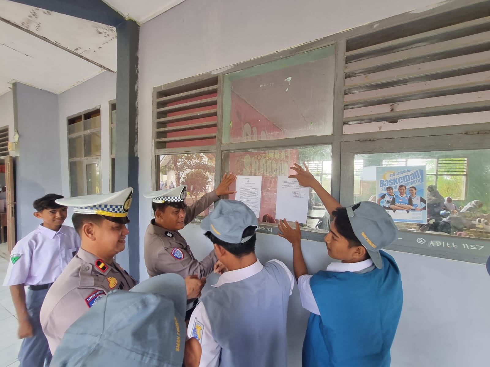 Selain memberikan penyuluhan, petugas juga menempelkan salinan Maklumat Kapolda Jabar di area strategis sekolah agar mudah dibaca dan dipahami oleh seluruh siswa maupun siswi.
