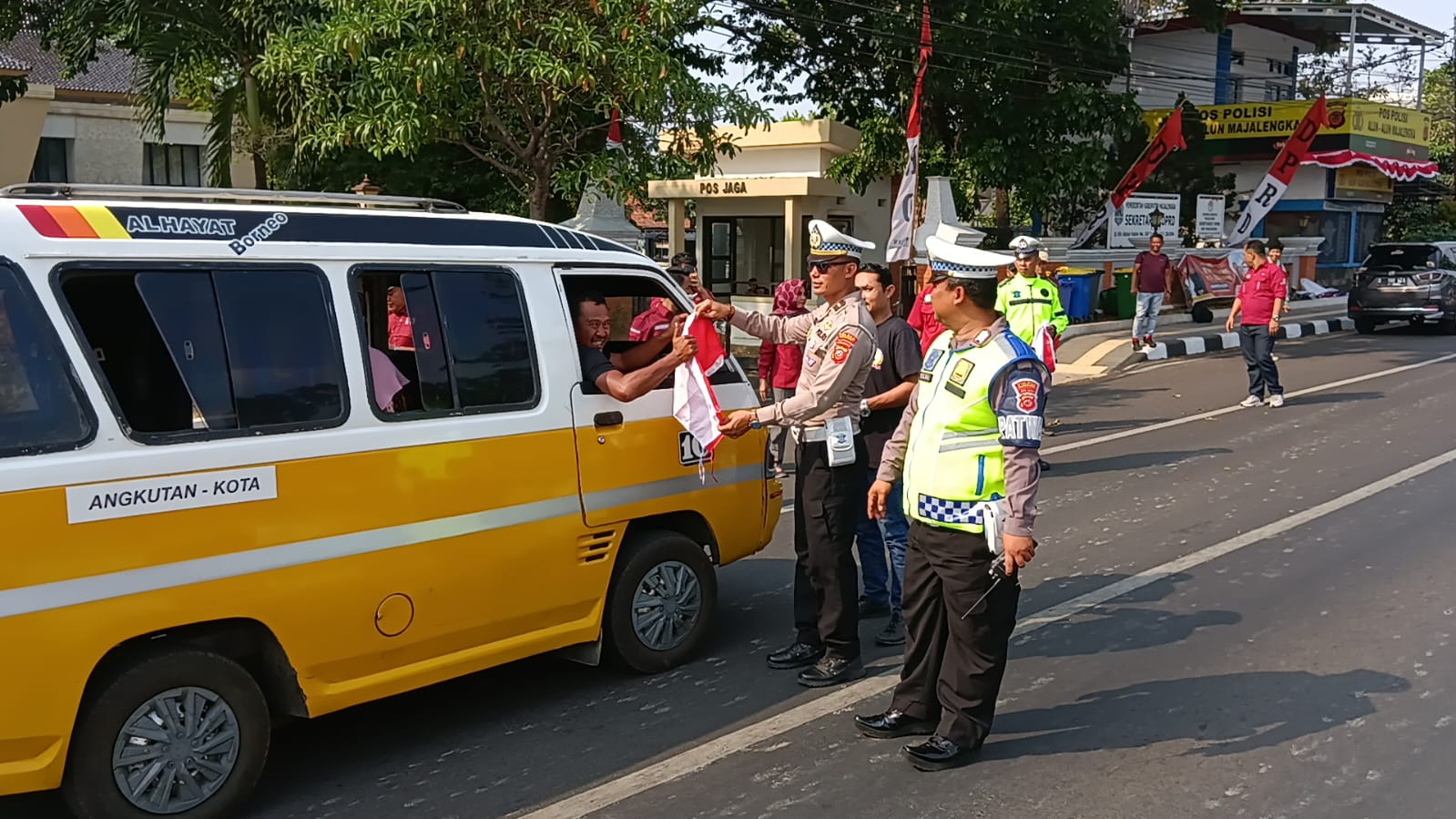 Majalengka,- Dalam rangka memupuk semangat kebangsaan dan memperingati momen penting yaitu Kemerdekaan RI Ke 78 Tahun 2023, Satuan Lalu Lintas (Satlantas) Polres Majalengka bekerja sama dengan Tenaga Kesejahteraan Sosial Kecamatan (TKSK) Dinas Sosial (Dinsos) Majalengka melaksanakan kegiatan berbagi bendera merah putih kepada pengendara di Jalan KH. Abdul Halim Alun-Alun Kabupaten Majalengka pada hari Rabu (9/8/2023).