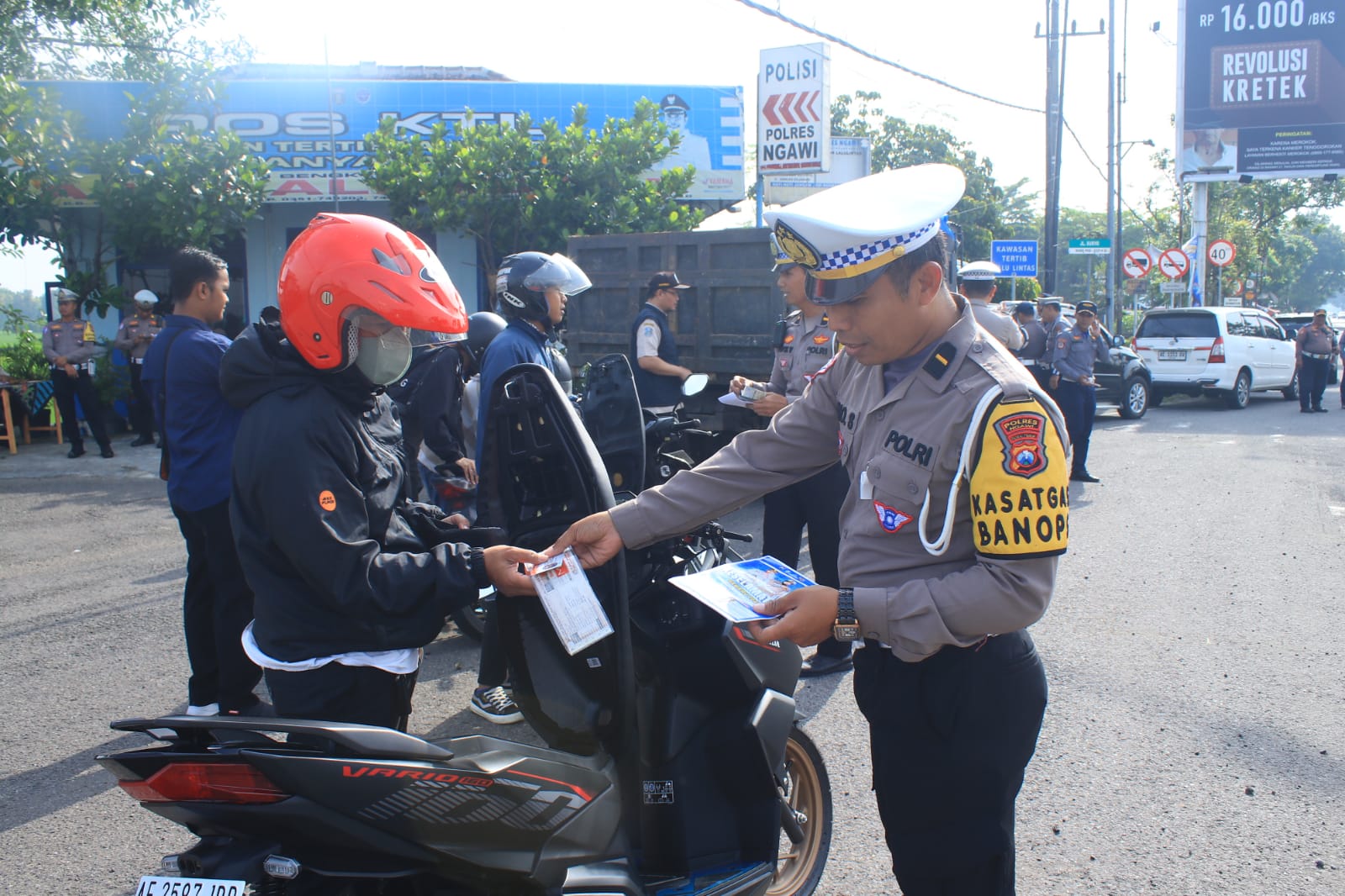 Polantas Polres Ngawi juga melakukan sosialisasi dengan membagikan brosur dan selebaran terkait pelaksanaan Operasi Keselamatan Semeru 2025.