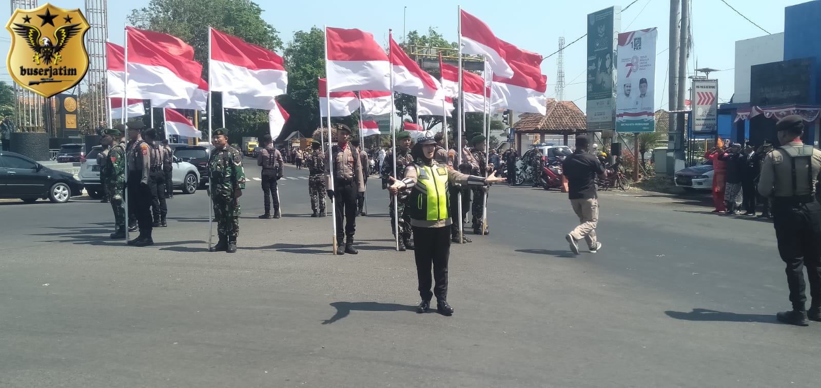 PROBOLINGGO, BUSERJATIM.COM – Satlantas Polres Probolinggo kota menggelar Peringatan Detik-Detik Proklamasi dengan menghentikan sejenak aktivitas di jalan dan berdiri tegak selama lagu Indonesia Raya dikumandangkan melalui mobil public address Unit Keamanan dan Keselamatan (Kamsel)