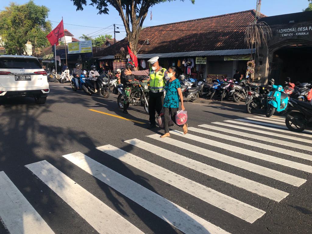 Lagi-lagi anggota satuan Lalu Lintas melakukan aksi yang dapat mengundang simpatik masyarakat di di jalan Raya Sempidi di jalan yang padat kendaraan, tepatnya di depan Pasar Adat Sempidi, Kelurahan Sempidi, Kecamatan Mangwi, Kabupaten Badung. Rabu, (25/1) pagi.