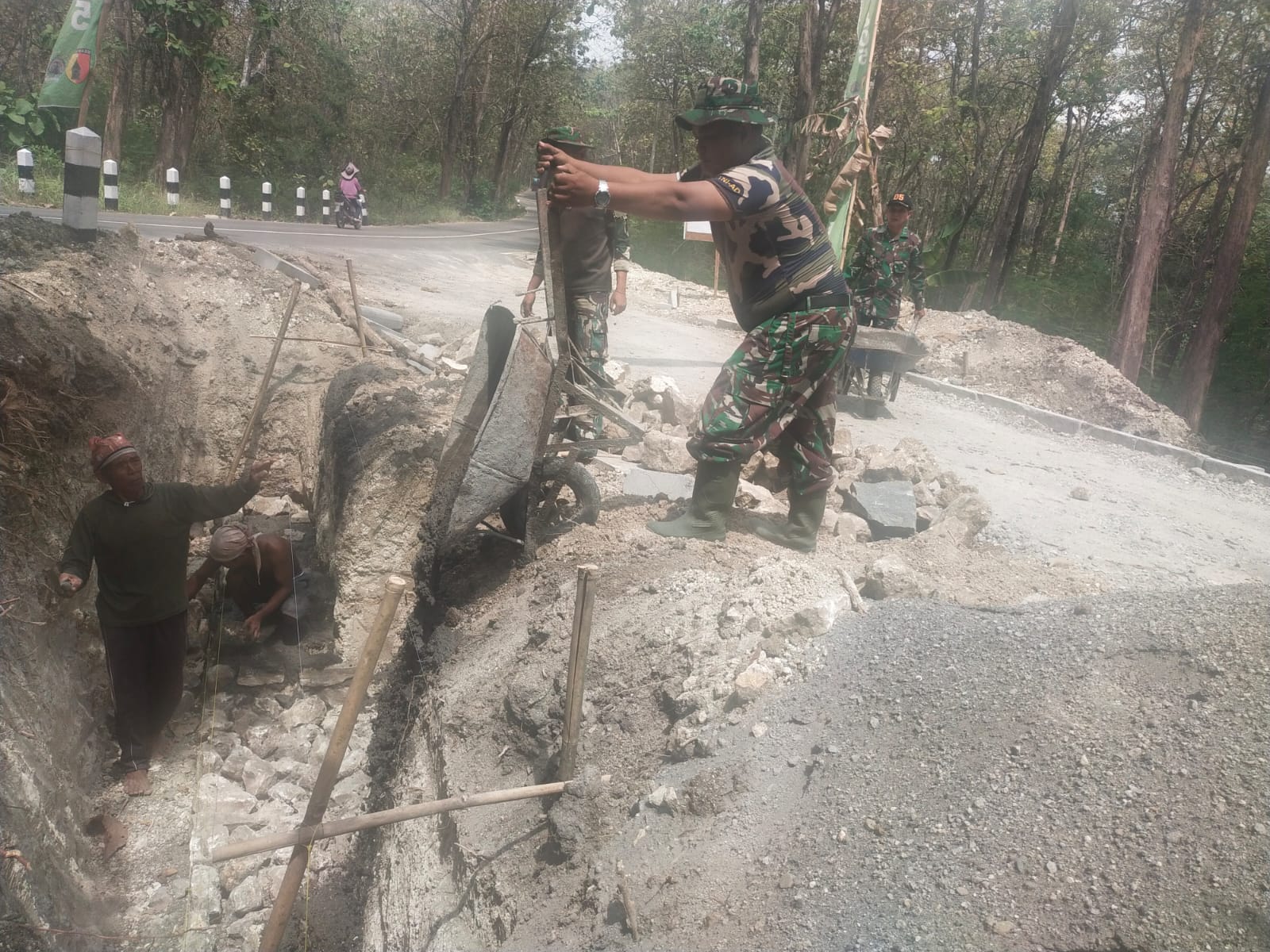 Dalam beberapa pekan terakhir, para anggota Satgas dan warga bergotong royong menyelesaikan pembangunan talud yang bertujuan untuk mengatasi masalah erosi tanah dan meningkatkan aksesibilitas jalan di wilayah tersebut. Suasana kerja keras dan kebersamaan terlihat jelas, dengan para pekerja berfokus pada setiap detail pekerjaan meskipun menghadapi cuaca panas di musim kemarau.
