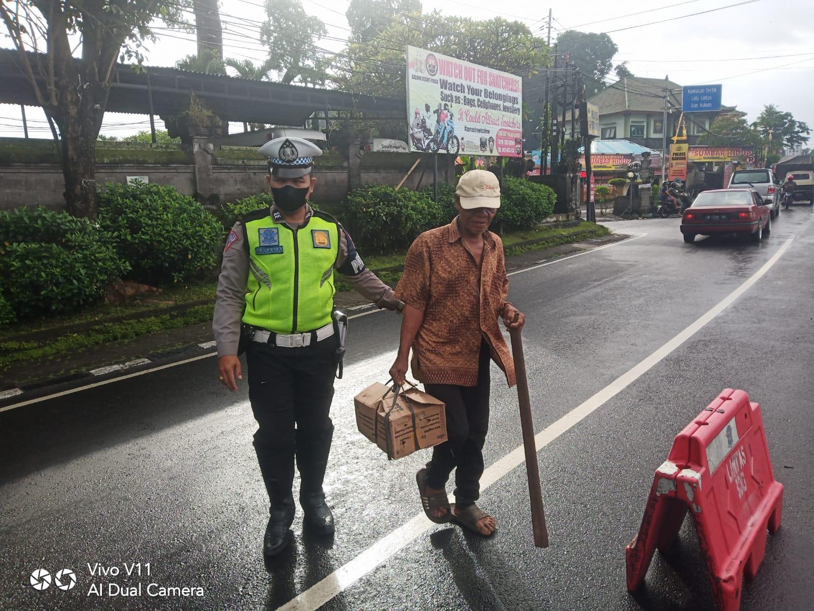 Seorang Polisi Lalu Lintas Polres Badung Aiptu I Kadek Ariana, SH menyebrangkan pejalan kaki di simpang Mapolres Badung jalan Raya I Gusti Ngurah Rai Mengwi, jalan yang menghubungkan Denpasar – Singaraja yang sarat dengan kepadatan. Kepedulian petugas ini, tentu saja membuat manis wajah sang kakek yang jalannya masih dibantu dengan tongkat kesayangannya. Rabu, (18/1) pagi