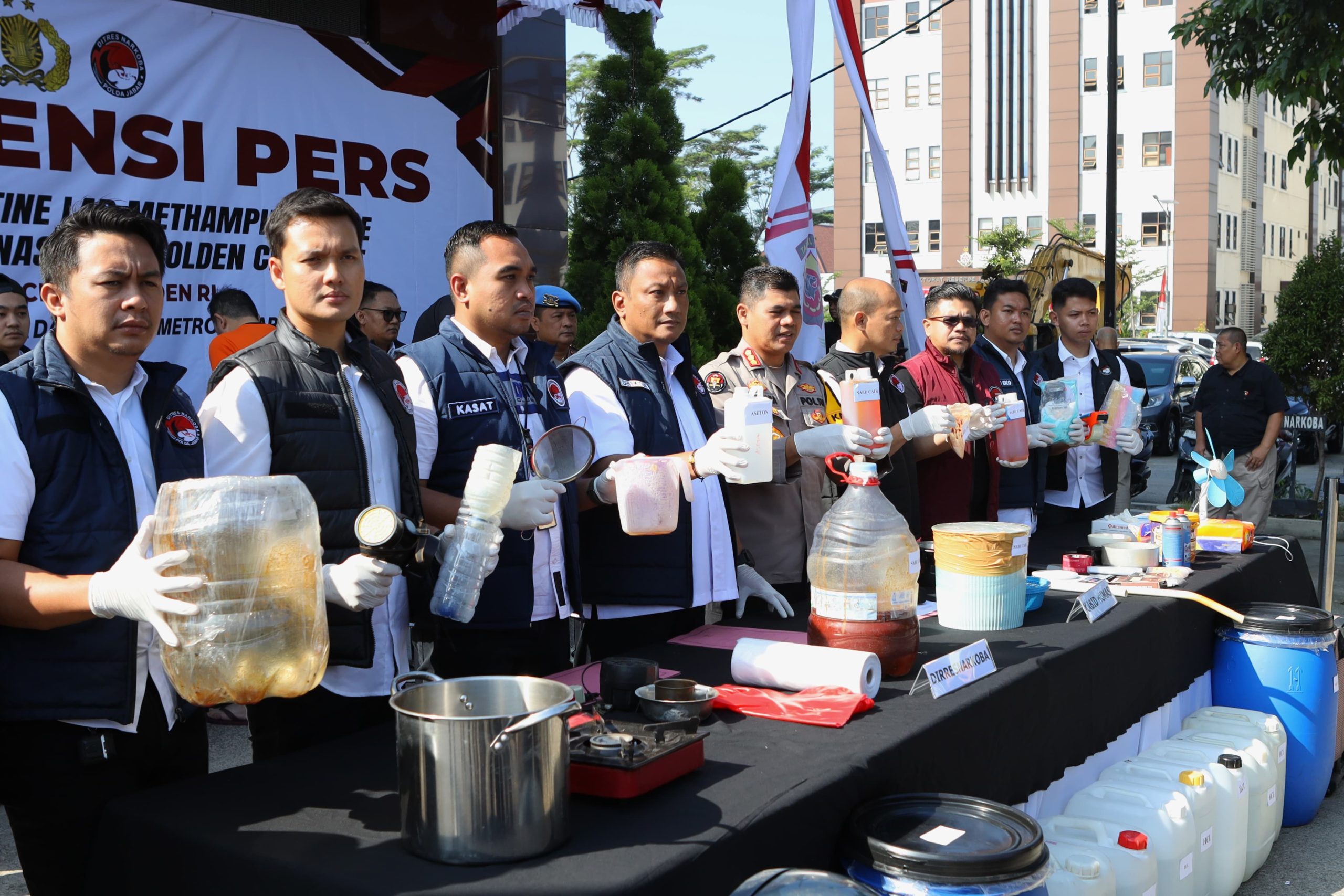 Direktorat Reserse Narkoba Polda Jawa Barat menggelar konferensi pers terkait pengungkapan laboratorium narkotika jenis sabu milik jaringan internasional “Golden Crescent”, bertempat di Gedung Ditresnarkoba Polda Jabar. Kamis (10/7/2025)