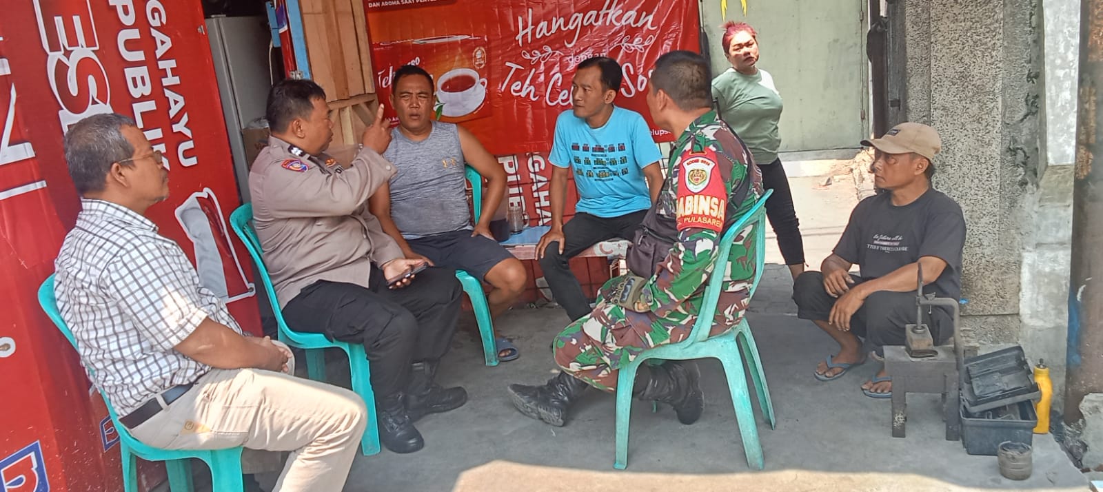 POLRES CIREBON KOTA,- Bhabinkamtibmas kelurahan Pulasaren Polsek Seltim Polres Cirebon kota Polda Jabar Aiptu Bubung Ramdhani bersama Babinsa serap informasi, sambang dialogis kepada tokoh masyarakat dan warga RW 03 kelurahan pulasaren , ajak peduli kamtibmas lingkungan, Sabtu (03/08/2024).
