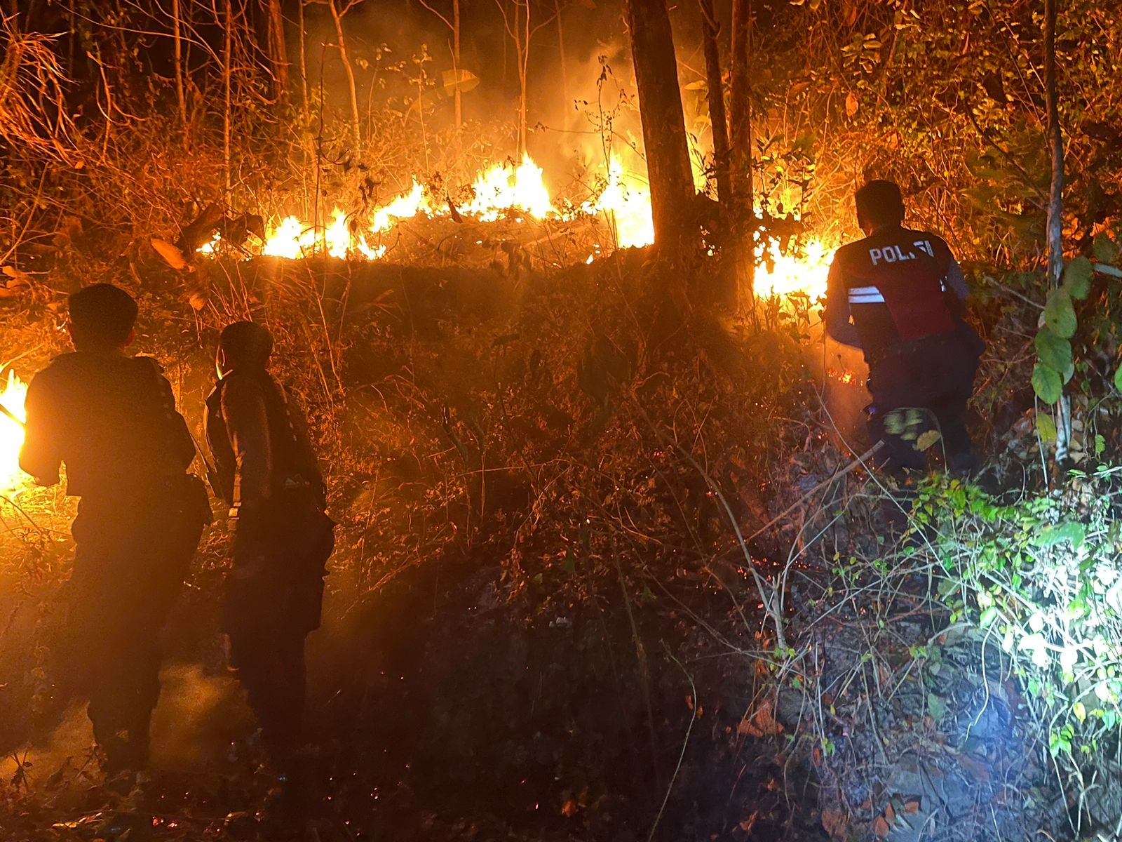 MAGETAN , BUSERJATIM. COM GROUP – Puluhan personil gabungan Polres Magetan dan TNI bersama BPBD, PMI serta masyarakat Kabupaten Magetan dikerahkan untuk memadamkan api yang membakar kebun jati rakyat di lereng gunung Bungkuk Desa Bungkuk Kecamatan Parang Kabupaten Magetan Jawa Timur, Minggu malam (13/08/2023).