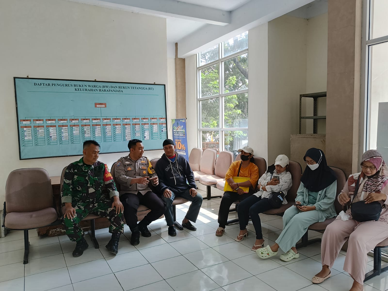 Polres Bogor. (Sinergitas TNI dan Polri) Polsek Cibinong melalui Bhabinkamtibmas Brigadir Sufria Dewangga bersama Babinsa Serka Sunardi melaksanakan kegiatan sambang ke kepada warga yang sedang membuat surat administrasi kependudukan di kantor kelurahan Harapan jaya Kecamatan Cibinong Kabupaten Bogor. Hari Senin (21/08/2023)