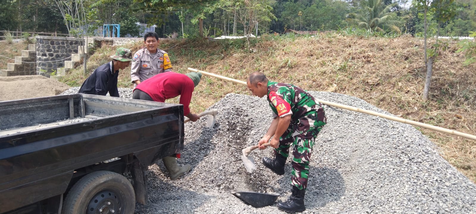 Dalam kegiatan tersebut, terlihat Aipda Edi Setiadi dan Babinsa bersama masyarakat bahu membahu menaikkan batu split ke mobil, sebagai bagian dari proses pembangunan embung. Kebersamaan ini menunjukkan kekompakan dan semangat gotong royong yang tinggi antara aparat keamanan dan warga.