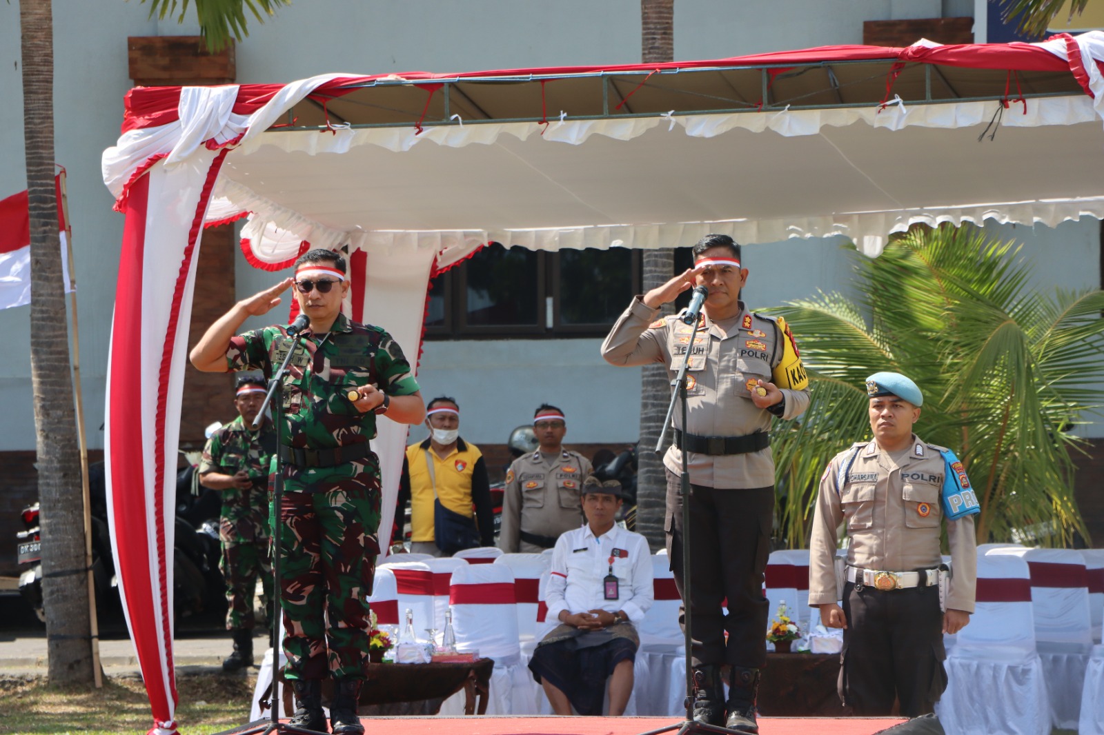 Kepolisian Resor Badung gandeng Kodim 1611/ Badung dan masyarakat kompak menggunakan ikat kepala pita merah putih sebagai lambang kesamaan tekat dan pemikiran tentang menjaga persatuan dan kesatuan dalam bingkai NKRI saat melaksanakan apel kesiapan dalam rangka menyambut Hari Kemerdekaan Republik Indonesia Ke-78 Tahun 2023 di Lapangan Umum Desa Tibubeneng, Banjar Tegal Gundul, Desa Tibubeneng, Kecamatan Kuta Utara, Kabupaten Badung, Bali. Senin 14 Agustus 2023 siang pukul 13.30 Wita.