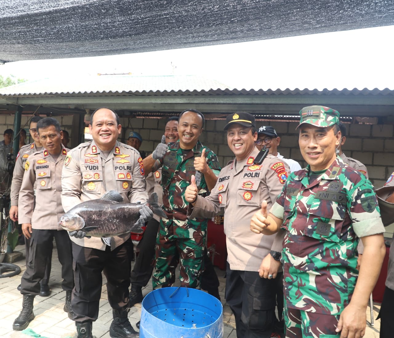 Sebanyak 2000 bibit ikan ditebar Kapolres Mojokerto ke dalam kolam bersama Dandim 0815 Mojokerto dan Forkopimda Kabupaten Mojokerto beserta elemen masyarakat. (Hary/Red-Humas)