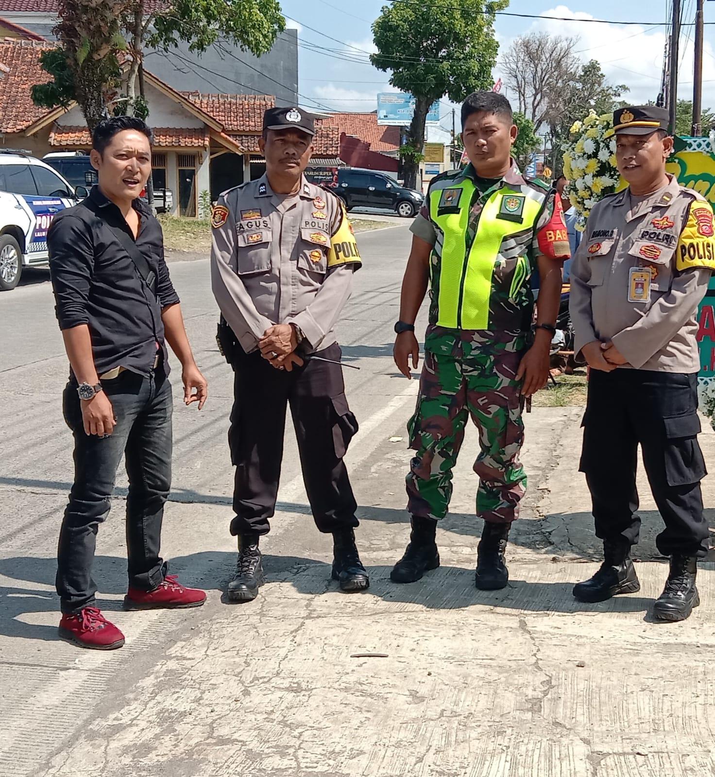Majalengka – Kekompakan TNI-Polri kembali terlihat saat Personil Polsek Cikijing Polres Majalengka Polda Jabar, Panit Binmas Ipda Brigmono R, S.H, Ps. Panit Samapta lll Aiptu Agus Sri Wandono, S.H, PS. Panit Ik. Aipda Endang Kosasih, Ps. Kasie Humas Bripka Deby dan Babinsa Koramil Cikijing Koptu Madsani melaksanakan pengamanan kedatangan Bupati Majalengka dalam rangka takziah kepada Alm. Drs. Nana Sukarna, M.Si di Desa Kasturi Kecamatan Cikijing Kabupaten Majalengka. Selasa (13/06/2023).