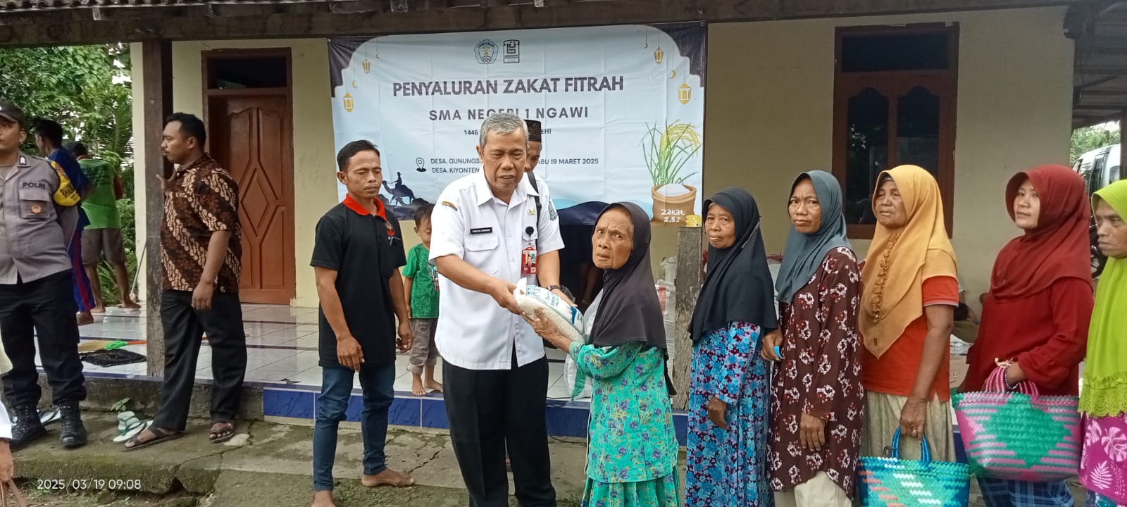 Penyaluran zakat tersebut dihadiri oleh Kepala Sekolah SMA N 1 Ngawi, Bapak Pontjo juwono yang mewakili kepala sekolah, bersama dengan para guru ,imam masjid Baitussuhada, belasan siswa SMA N 1 Ngawi, serta kepala desa , masyarakat Gunungsari yang berhak menerima zakat fitrah. (19 Maret 2025)