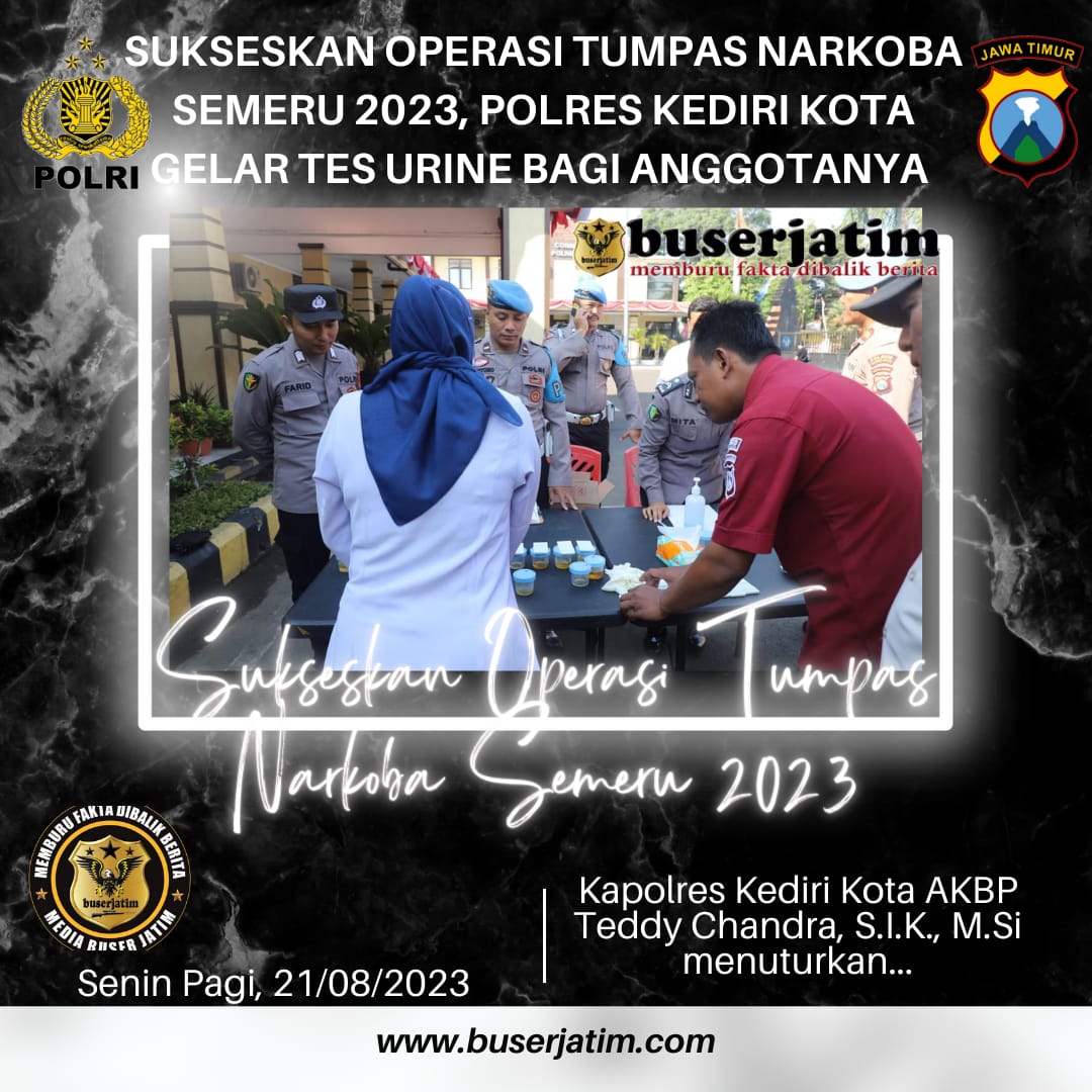 Kapolres Kediri Kota AKBP Teddy Chandra, S.I.K., M.Si menuturkan, pemeriksaan urine ini merupakan tindak lanjut dari instruksi Kapolri maupun Kapolda Jatim agar personel Polri tidak ada yang bermain-main dengan Narkoba, serta saat ini juga berlangsung oeprasi Tumpas Narkoba Semeru 2023