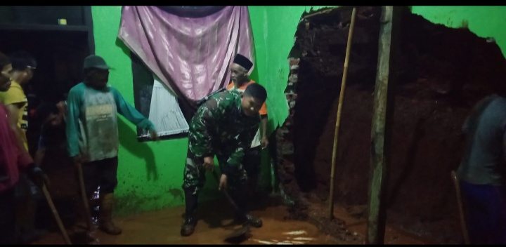 Majalengka – Anggota Koramil 1705/Cikijing Kodim 0617/Majalengka bersama Polsek Cingambul dan masyarakat setempat mendatangi lokasi kejadian tanah longsor yang menimpa rumah bagian belakang milik salah satu warga, di Blok Desa RT 02 RW 02 Desa Maniis, Kecamatan Cingambul, Kabupaten Majalengka, pada Sabtu (16/3/2024) malam.