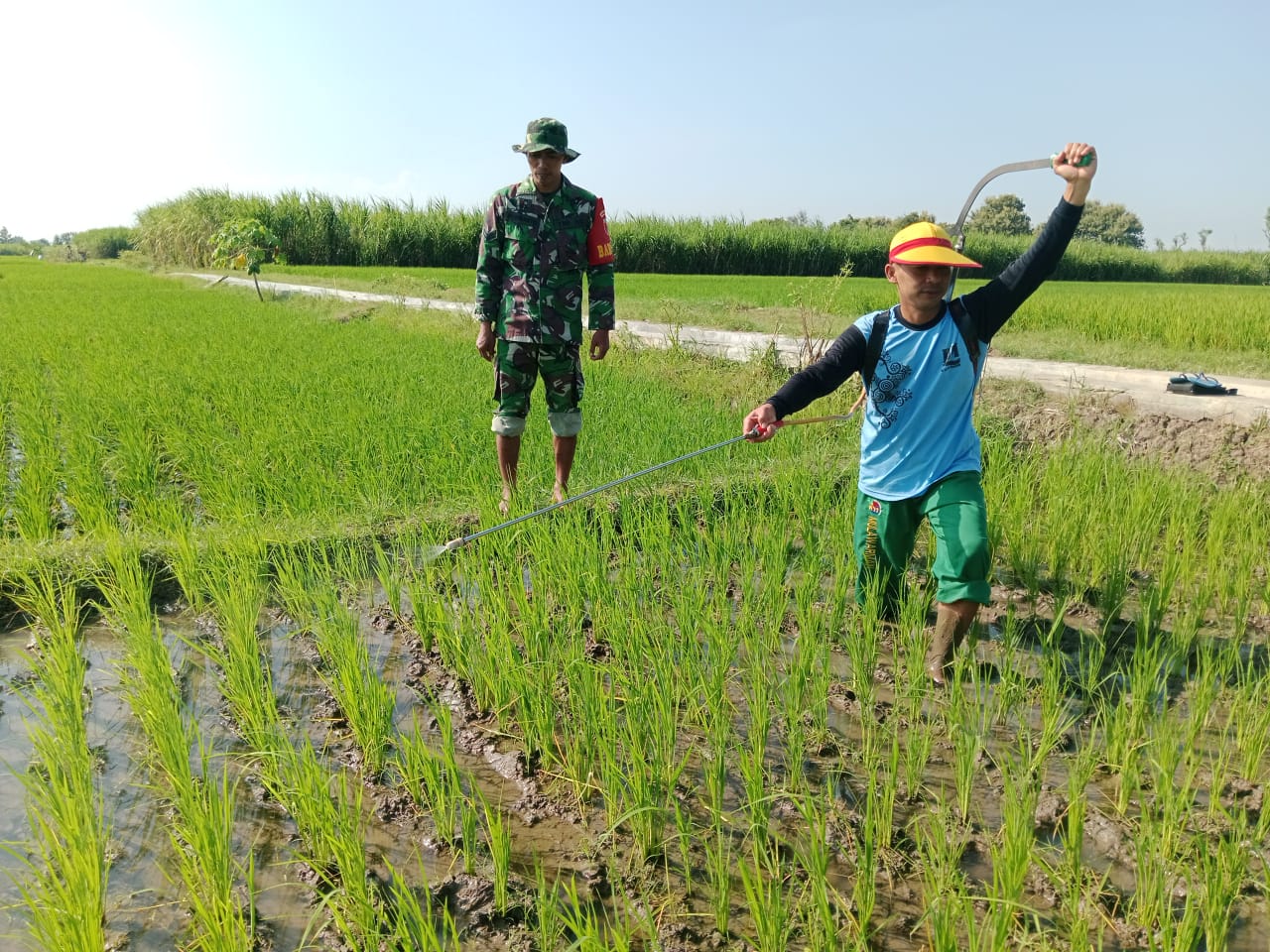 Sertu Purwanto menuturkan kali ini babinsa juga ikut ke sawah untuk menyemprot tanaman padi, Penyemprotan ini guna mengantisipasi hama ulat maupun wereng. Selain itu juga untuk memberikan kesuburan terhadap batang padi serta menghilangkan rumput ilalang yang tumbuh di sekitar tanaman padi.