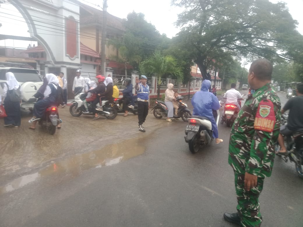 Personel Polsek Gabuswetan terlihat berdiri tegap di tengah hujan, memastikan arus lalu lintas di beberapa ruas jalan utama tetap berjalan lancar dan aman. Kehadiran mereka sangat membantu para pengendara, terutama saat kondisi jalan licin dan jarak pandang terbatas akibat hujan.