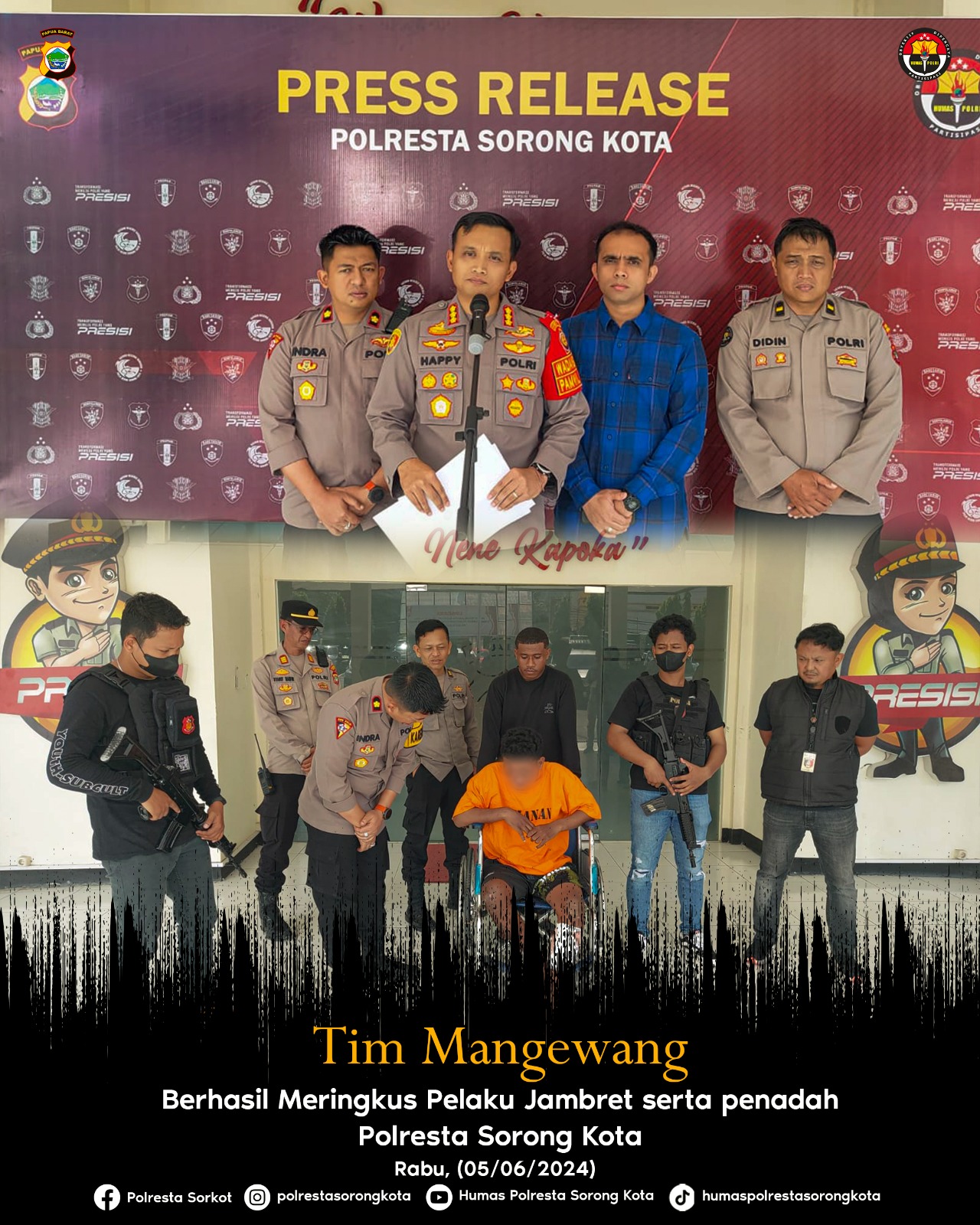“Untuk Pelaku kejahatan dikota sorong Tolong hentikan tindakan kalian di kota sorong karna cepat atau lambat akan kami tangkap dan kami kejar serta melakukan tindakan tegas dan terukur” tutup Kapolresta Sorong Kota