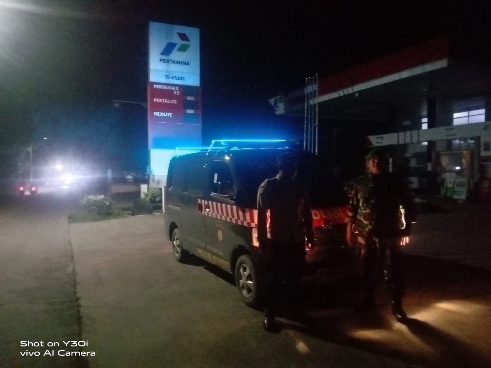 Kehadiran kendaraan patroli dengan lampu biru yang khas semakin memperkuat kesan aman di malam hari.