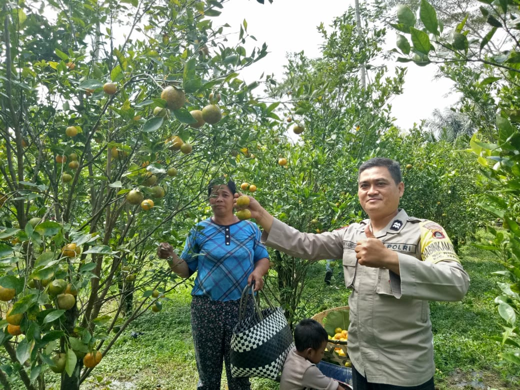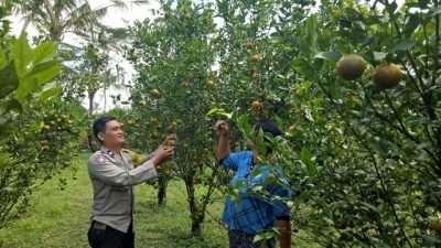 Jalin silaturahmi, Bhabinkamtibmas Polsek Bangli melaksanakan kegiatan patroli wilayah binaan dan menyambangi warga. Dalam sambangnya kali ini Bhabinkamtibmas Aiptu I Dewa Gede Kardiasa bertemu dengan Warga Ni Wayan Sukarmi yang sedang metik jeruk diKebunnya, Banjar Sunting, Desa Pengotan, Kec./Kab. Bangli. Senin siang (07/08/2023).