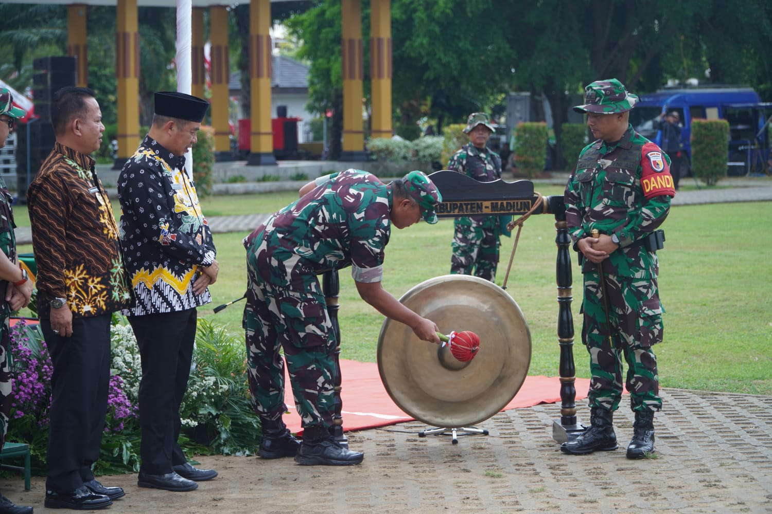 Dandim 0803/Madiun, Letkol Kav Widhi Bayu Sudibyo, turut hadir bersama jajaran Forkopimda Kabupaten Madiun. Ia menyampaikan terima kasih kepada seluruh pihak, terutama masyarakat, yang dengan penuh semangat bergotong royong mendukung pelaksanaan TMMD di Dusun Nglengko, Desa Ngranget, Kecamatan Dagangan.