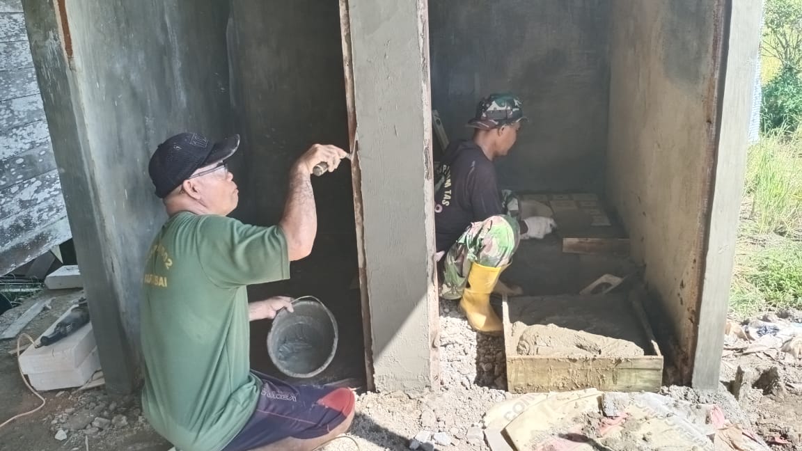 Pantauan di lapangan pada Sabtu (17/5/2025) menunjukkan anggota Satgas TMMD ke-124 Kodim 1002/HST sedang fokus pada pemasangan closet dan pengacian dinding MCK yang baru dibangun.