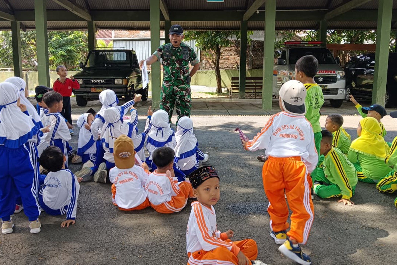Prajurit pilihan Kodim, Pelda Suwoto, kembali dipercaya sebagai pemateri utama dalam sesi Wawasan Kebangsaan. Dengan gaya komunikatif dan penuh canda, ia mengajak anak-anak mengenal nilai-nilai dasar cinta tanah air, hormat kepada orang tua, serta semangat gotong royong. “Anak-anak hebat harus cinta Indonesia, ya! Kalau cinta Indonesia, harus rajin belajar dan bantu teman,” ujar Suwoto sambil tersenyum, disambut riuh “Siap, Pak TNI!” dari para peserta.